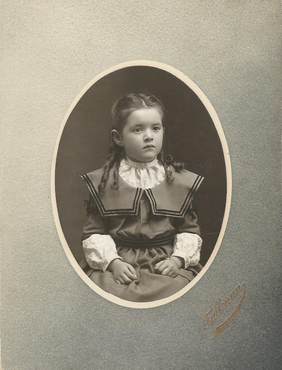 A young woman plays the guitar as she poses for her portrait by a railroad photographer. The Fallman studio was actually located on a train car. Printing on the front of the cabinet card notes that the photographer utilized a Parlor Photo Car. Some photographers, like Mr. Fallman, would rent or purchase a railroad car and travel from town to town. Sometimes the car would be disconnected from the train and the photographer would operate his studio until business conditions dictated that he move on to another locale. Fallman’s parlor car obviously contained backdrops and props. The woman in this photograph is sitting on a hammock next to a box topped with a couple of books. Preliminary research failed to uncover details about Mr. Fallman. However, the Cabinet Card Gallery possesses a vintage photograph of a cute little girl by Harry Fallman (1853-1907). His studio was located in Eureka, South Dakota. During his lifetime, Harry also lived and worked as a photographer in North Newberg and Portland, Oregon. It is unknown if Harry is the same Fallman who operated the rail car studio that produced the photograph above. To view Harry Fallman’s photograph and to learn more about him (and his celebrity son), click on the category “Photographer: Fallman”. SOLD