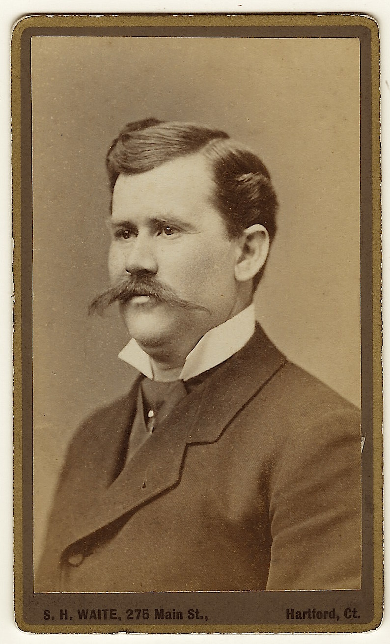This carte de visite portrait features a well-dressed handsome gentleman wearing a handlebar mustache. This photo as taken by S. H. Waite who operated a studio in Hartford, Connecticut. Stephen H. Waite (1832-1906) is known for a photograph he took of African American orator and abolitionist Frederick Douglass. The Connecticut Historical Society’s website offers a brief biography of Stephen Waite. He was born in Massachusetts and as a young man was friends with Ralph Waldo Emerson (essayist, poet), John Greenleaf Whittier (abolitionist, poet), and Theodore Parker (Unitarian minister, Abolitionist). He opened his Hartford photography studio in 1863 and conducted business until 1879 when he was succeeded by Charles Stuart. He later worked as a photographer in Kansas City, and later retired and died there. This cdv photograph has excellent clarity and is in good condition (see scans).