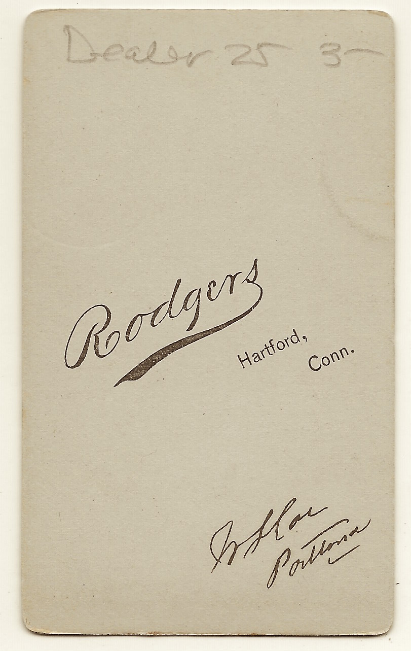 This carte de visite features an old man wearing a “neck beard”. This style of beard was popular in the 19th century. This gentleman is in good company. Other neck bearders include Richard Wagner (composer), Henry David Thoreau (Essayist, Poet, Philosopher), and Horace Greeley (Author, Statesman, Newspaper Editor). It is interesting to note that in today’s culture, “neck beard” is a perjorative term for social awkwardness or pretentiousness. The subject of this cdv photo is well dressed. He gives the appearance of a kind good humored man. The photographer of this image is the Rodgers studio, which was located in Hartford, Connecticut. The Connecticut Historical Society’s online site provides some information about Hart J. Rodgers (1831-1905). During the 1850’s he worked as a daguerreotypist in New Haven, Connecticut. In 1855, he married Grace A. Rodgers. By 1871, he was operating a photo studio in Hartford. Interestingly, in the 1880’s he was the owner of a skating rink. This cdv image is in very good condition.