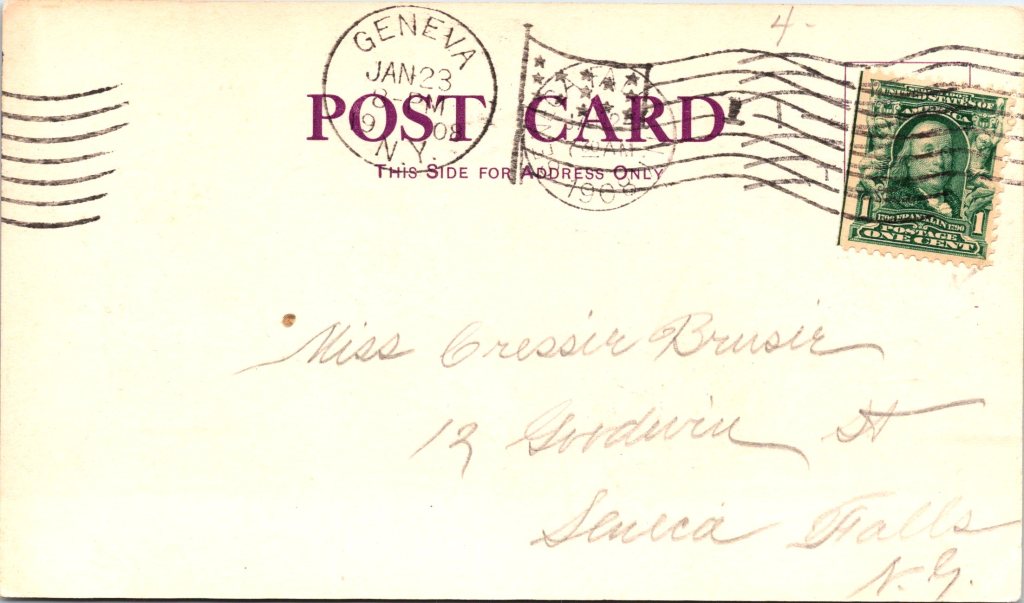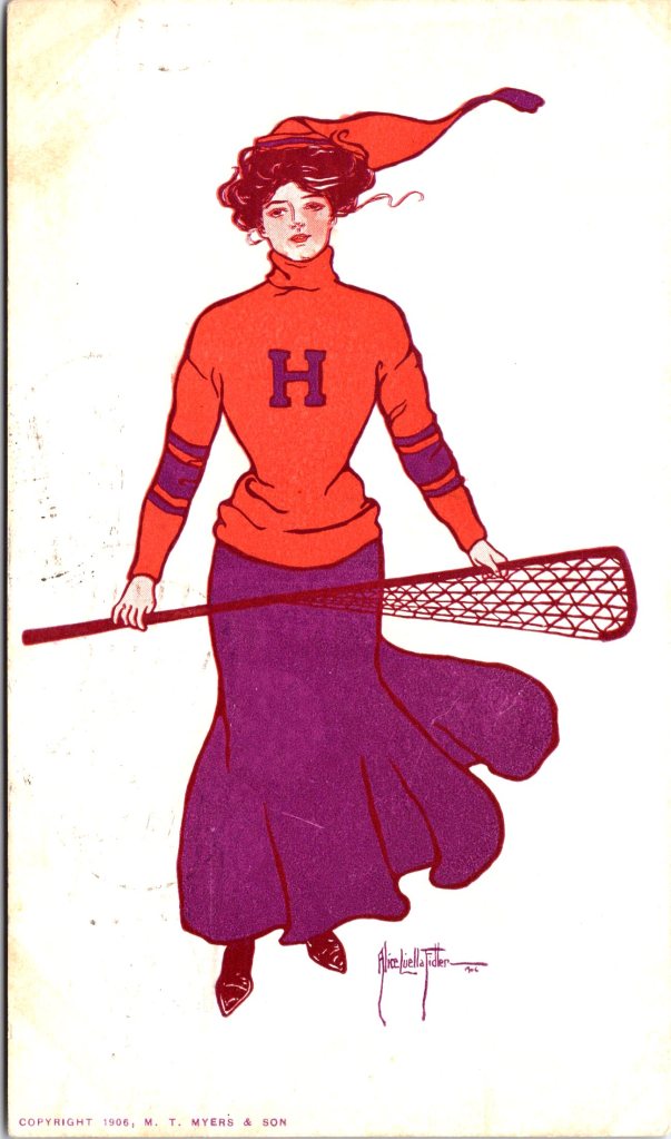 This undivided back vintage printed postcard features a pretty young woman holding a lacrosse stick and wearing a Harvard Sweater. The artist The artist has created a fun postcard with vibrant colors. The artist of this card, Alice Luella Fidler (1883-?), is well known and famous for her talent. In the early twentieth century, Alice and her two sisters, Pearle Eugenia Fidler LeMunyan (1880-?), and Elsie Catherine Fidler (1892-?); specialized in creating drawings of beautiful girls and women. This postcard is from the “College Lad and Lassie” series, produced in 1906. The sisters were wonderful illustrators and most of their drawings were published as postcards. This postcard was published by M. T. Myers & Son. The card was postmarked in 1908. SOLD