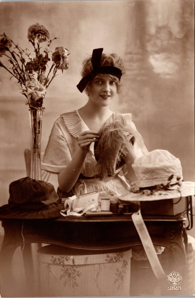 This vintage real photo postcard shows a hat maker in action. She sits at her millinery table and flashes the photographer a smile. Note her hat making supplies on the table. You can also see a large hat box beneath the table. This postcard was published by Alfred Noyer as part of a series (no.3123). (SOLD)