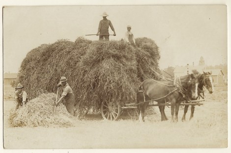 This vintage real photo postcard features four hard working men gathering hay and loading their horse drawn wagon. The wagon is chock full of hay. It is hard to imagine that the wagon can fit much more hay. The AZO stamp box on the reverse of the postcard indicates that the card was published sometime between 1904 and 1918. This occupational postcard is in very good condition (see scans).