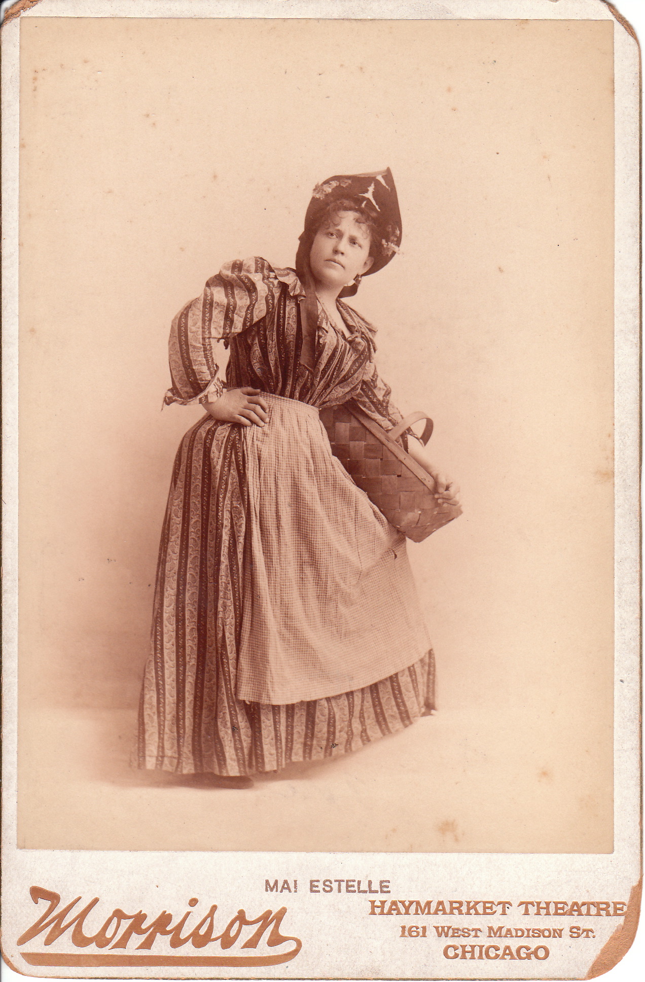 This cabinet card photograph features stage actress Mai Estelle in costume for an unknown production. Her given name was Mai Twiggs Wynkoop. Preliminary research yields little information. In 1889-1990 she starred in the New York production of “Myrtle Ferns”. She performed on Broadway in “Maternity” (1915). The photographer of this image is William Mckenzie Morrison (1857- ?). Morrison was a well known celebrity photographer who housed his studio in the Haymarket Theatre Building between 1889 and 1899. He then moved his studio to the Champlain Building. Morrison was quite successful. He had a ranch in South Dakota and a summer home in Palisades, New Jersey. The Cabinet Card Gallery includes other photographs by Morrison. The images can be seen by clicking on the category “Photographers: Morrison”.