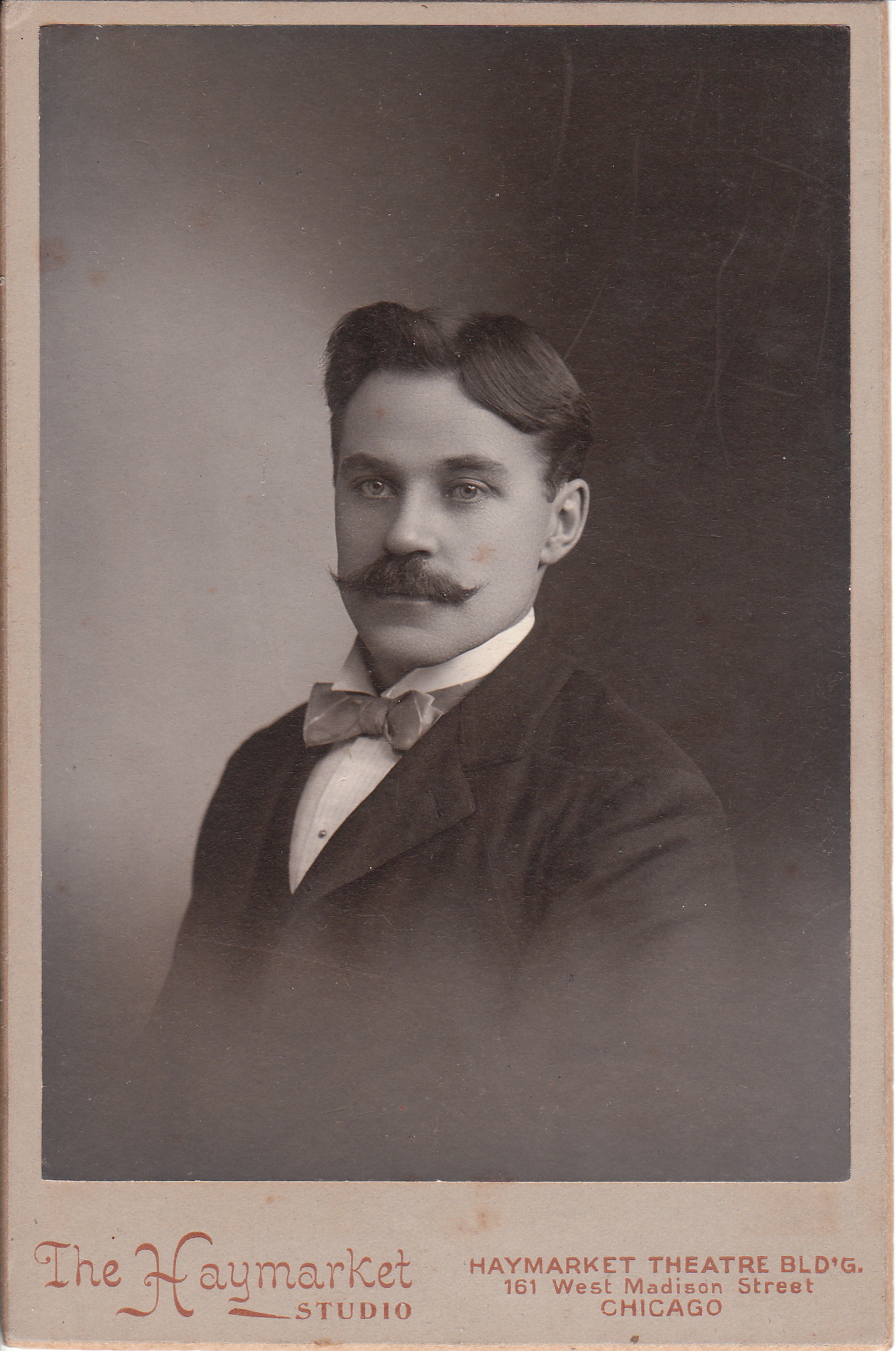 A handsome and well dressed young man poses for his portrait at the Haymarket Studio in Chicago, Illinois. The studio was located in the Haymarket Theatre Building. The subject may be an actor from one of the theatre’s productions. The gentleman has an interesting hairstyle and a wonderful mustache. This cabinet card lists the studio that took the photograph, but does not name the photographer. Morrison, was a well known photographer who operated out of the Haymarket Theatre Building and ads advertising the sale of his studio appear in a number of photographic journals of 1900. Perhaps the photographer who created this image was a successor to Morrison. To view photographs by Morrison, click on the category “Photographer: Morrison”.