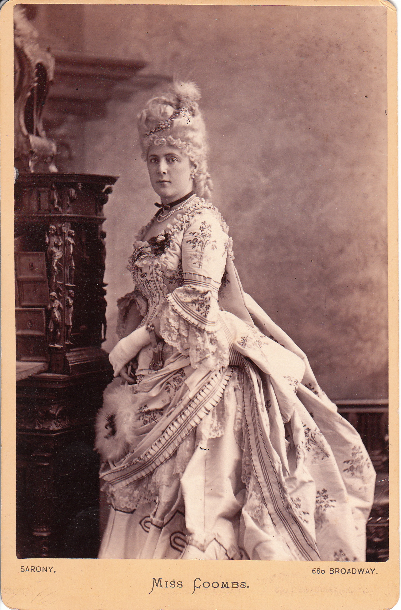 Jane Coombs (1842-?) was an American actress who made a sensational debut during the 1855-1856 theatre season. She starred opposite Edwin Forrest at New York’s Broadway Theatre. In 1861 she starred in a production at the Haymarket Theatre in London, England. The New York Times (1864) describes a graceful tribute to “the charming actress”. The Nebraska State Journal (1894) published a very insulting article about the actress. The article reports that a man stole large packages with Miss Coombs name printed on them, from a hotel baggage room. Apparently, he was hoping to find diamonds in the packages. Upon opening the packages he found two thousand billboard portraits of Miss Coombs. The journal concludes that “Anybody who has had the doubtful pleasure of beholding Miss Coombs, will sympathize with the thief, and decide that in this case, his punishment was greater than his crime”. The author of this article, may be gifted with a sense of humor, but his description of Jane Coombs, at age 52, is certainly quite cruel. She certainly does not look unattractive in this cabinet card portrait by Napoleon Sarony. Sarony was a famed celebrity photographer in New York. Other images by Sarony can be viewed by clicking on the category “Photographers: Sarony”.