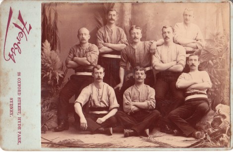 This cabinet card is a portrait of eight very athletic looking men. The men are dressed very similarly. Their pants appear to be identical and they each are wearing a wide white belt around their waists. The image presents a number of questions. Are these Aussie blokes wearing a uniform? Are they members of a sports team? Are they wearing work clothing and all share the same occupation? Hopefully some Cabinet Card Gallery visitors will leave a comment that gives their opinion as to the answers to the aforementioned questions. The photographer of this image is Herbst of Sydney, Australia. He is mentioned in a number of Sydney newspapers published in the 1890’s. Advertisements for his studio appear in the newspapers, and there is mention of some of the notables he photographed.