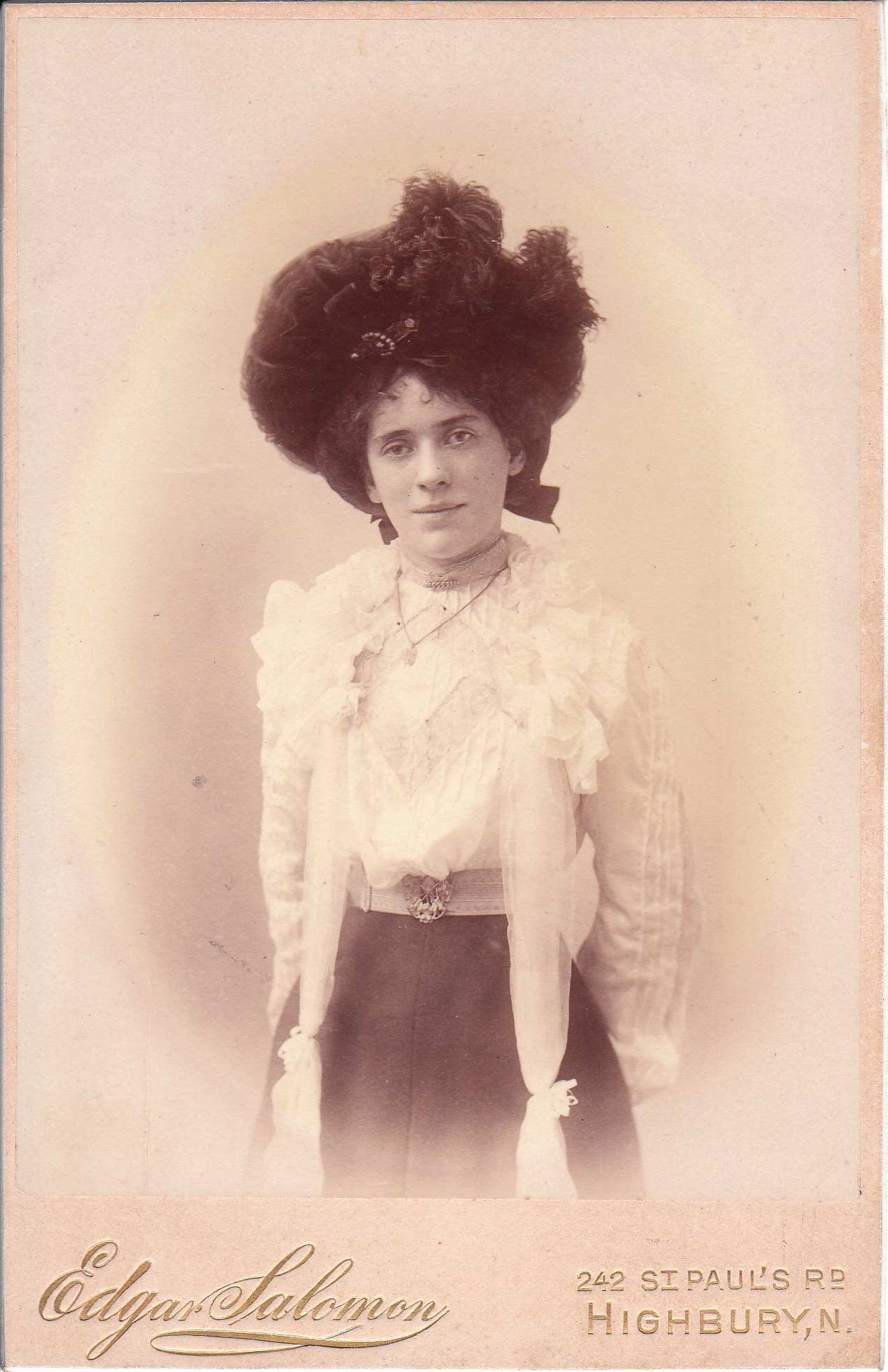 An internet dictionary defines funky as ” modern and stylish in an unconventional or striking way”. The pretty young lady in this cabinet card photograph is certainly dressed in a funky manner. She has a great smile and is remarkably well poised as she stands before the camera. Her scarf appears to be made of a fine fabric, and seems to be tied at the ends by ribbons. She is wearing an interesting belt with a decorative buckle. She is also wearing a terrific hat. Note her necklace and the brooch at her collar. A pencilled notation on the reverse of the cabinet card indicates that the young woman in the image is eighteen years of age and that the photograph was taken in 1902. The photographer was Edgar Salomon. He had a studio in two English cities; Highbury and London. This cabinet card portrait is in very good condition (see scans).