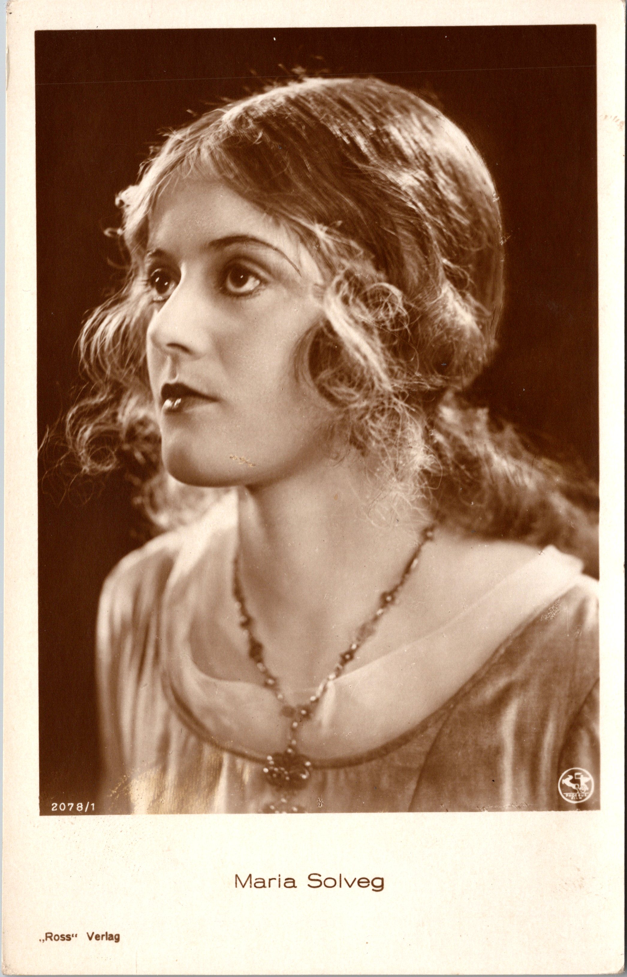 This vintage real photo postcard features German film actress, dancer, and screenwriter Maria Solveg (1907-1993). She was also known as “Maria Matray”. Solveg was a star of the late Weimar film era. She married her mentor, director and choreographer, Ernst Matray. When Hitler rose to power, Solveg, who was Jewish, fled the country. She came to the United States in 1936 and launched a career as a choreographer and writer. She worked in Hollywood as a choreographer or assistant director during the 1940’s. Her well known movies included “The Hunchback of Notre Dame” (1939), “Pride and Prejudice” (1940), and “Dr Jekyl and Mr Hyde” (1941). In the 1950’s she wrote scripts for television. She became a German citizen again in 1960. The IMDb gives Solveg 52 credits for writing and 22 acting credits. This postcard was published by Ross Verlag as part of a series (no.2078/1). (SOLD)