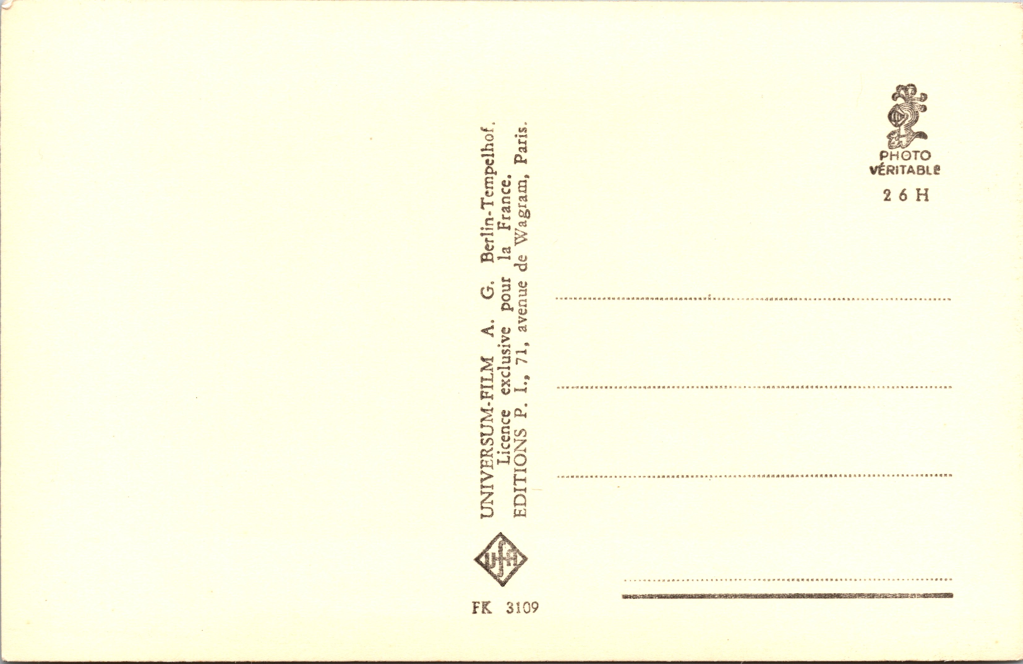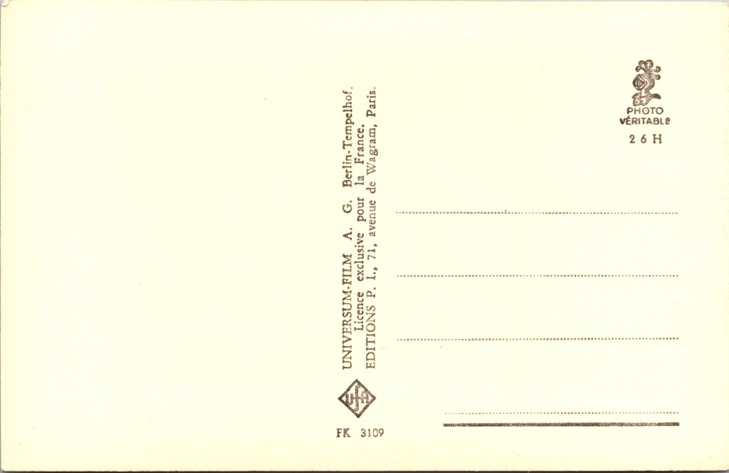 Postcard 1 was published by Ross Verlag as part of a series (No.4123/1). The logo for “United Artists” can be seen in the lower right hand corner of Horn’s image. This postcard has a 1930 postmark. (SOLD)
