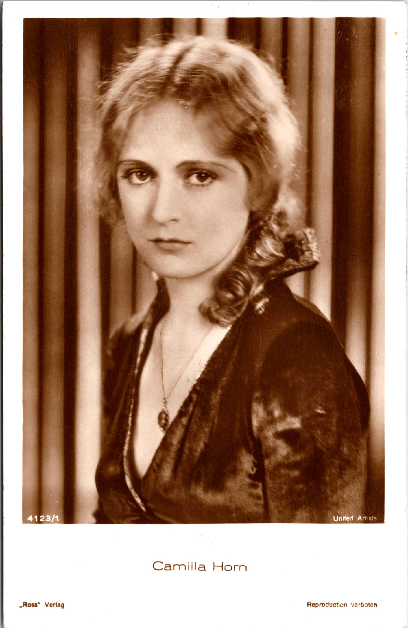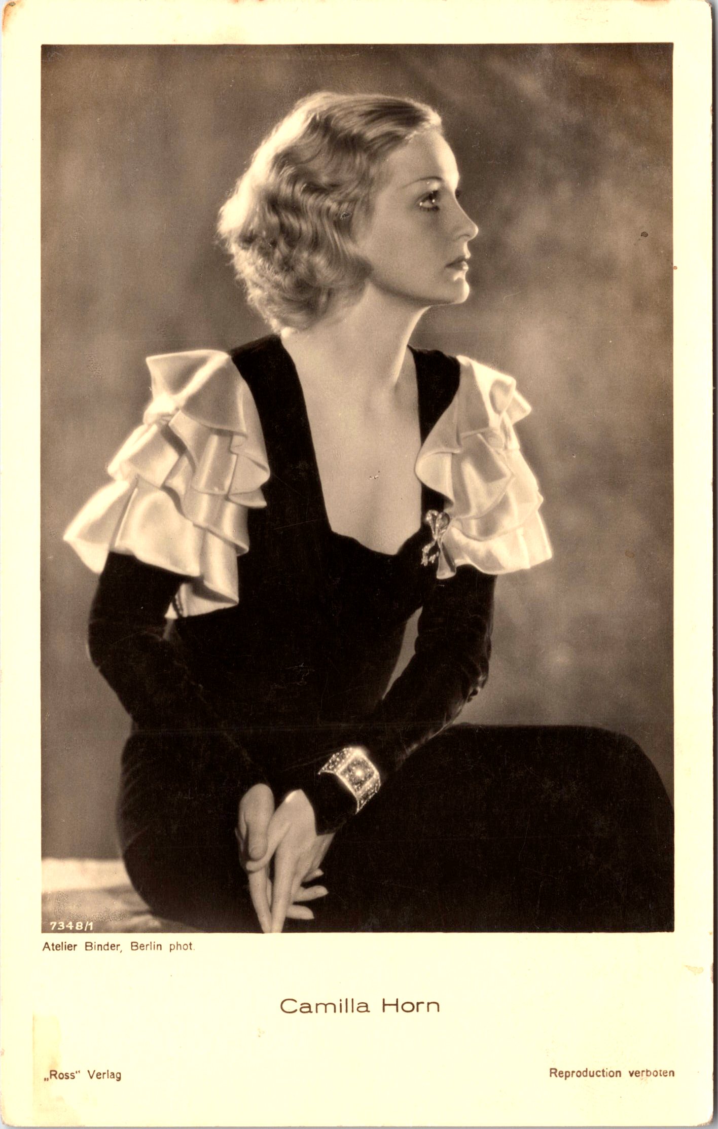 These vintage real photo postcards feature German dancer and film star of the silent and sound era, Camilla Horn (1903-1996). She also was an internationally known actress, starring in several Hollywood films of the late 1920’s as well as a few British and Italian productions. Her father was a civil servant working in the Railroad Industry. She was born in Germany and educated in Germany and Switzerland. Horn was educated to work as a dressmaker. She went to Berlin where she trained as an actress and dancer. She next became a cabaret dancer. In 1925, she worked as an extra in a German film. Her big break came in 1926 after she replaced Lillian Gist in the UFA production of “Faust”. In 1928 she left for Hollywood where she played opposite John Barrymore in “Tempest” and “Eternal Love”. She became romantically involved with film director, Joseph Schenck. She returned to Europe (upon the advent of sound film) and in the 1930’s got in trouble with the Nazis and was prosecuted for an alleged financial offense. During the war years, she was too outspoken against the Nazis. The regime investigated her. She tried to escape unsuccessfully to Switzerland. Thereafter, she kept a low profile. After the war, she was convicted by a British tribunal and sentenced for three months of jail due to some minor offenses. It was also reported that post war, she worked as an interpreter for occupying American forces. Horn was a screen star from 1930 until her retirement in 1953. Horn was married four times during her life. Interestingly, in about 1972 Bruce Springsteen wrote a song about her. Camilla Horn was quite beautiful. She had blonde hair, slanting brown eyes and classical features.