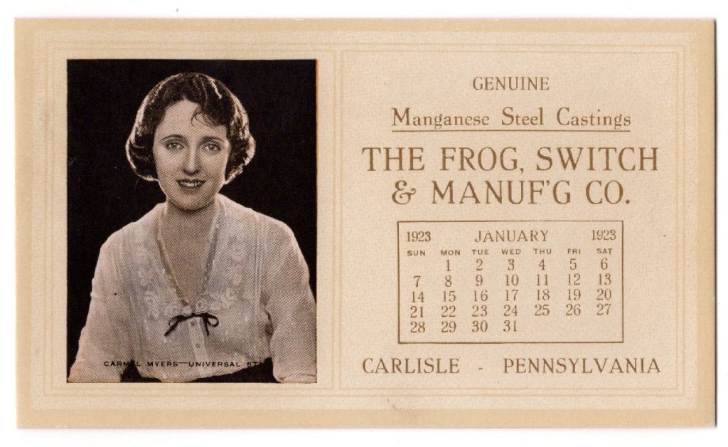 Blotter 1 is a vintage ink blotter that advertises the Frog Switch & Manufacturing Company, located in Carlisle, Pennsylvania. The blotter has a calendar for January, 1923. The blotter also features a photograph (litho) of Carmel Myers. (SOLD)