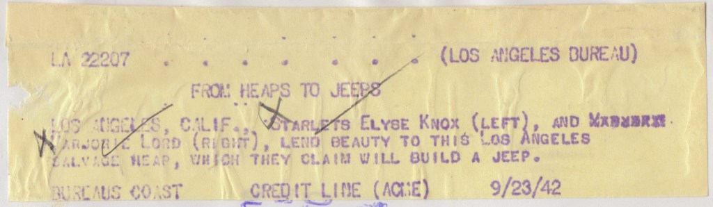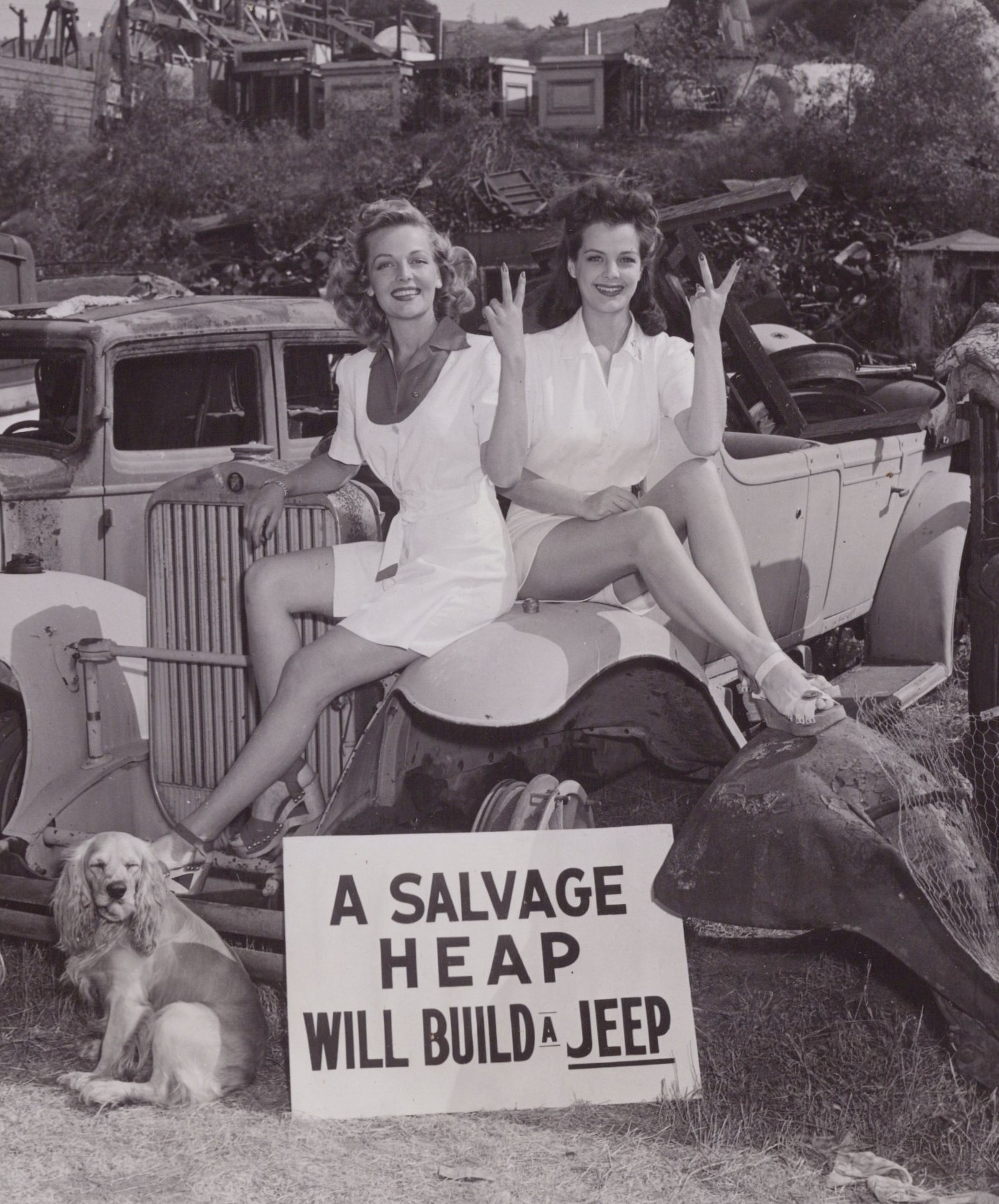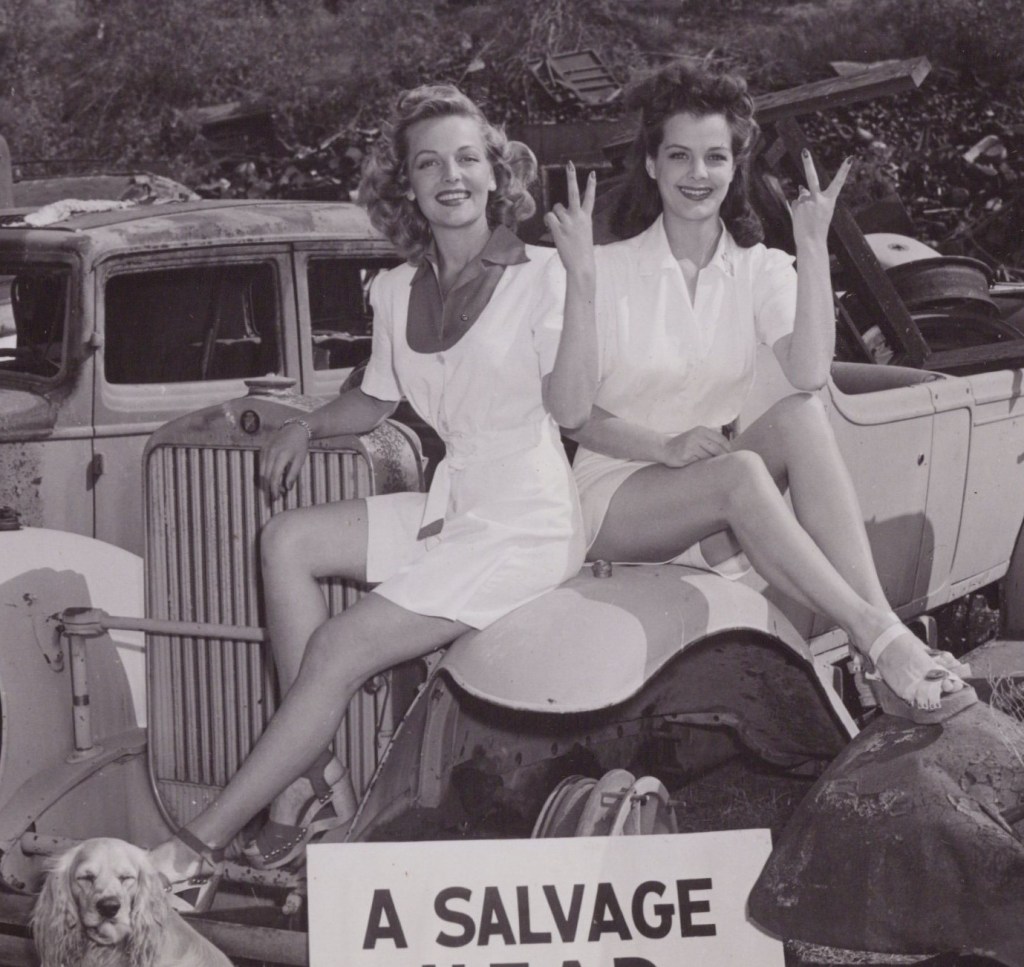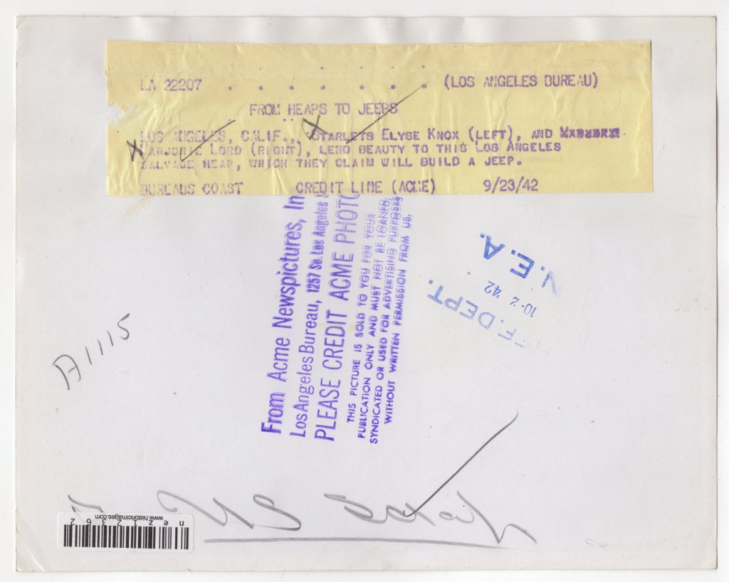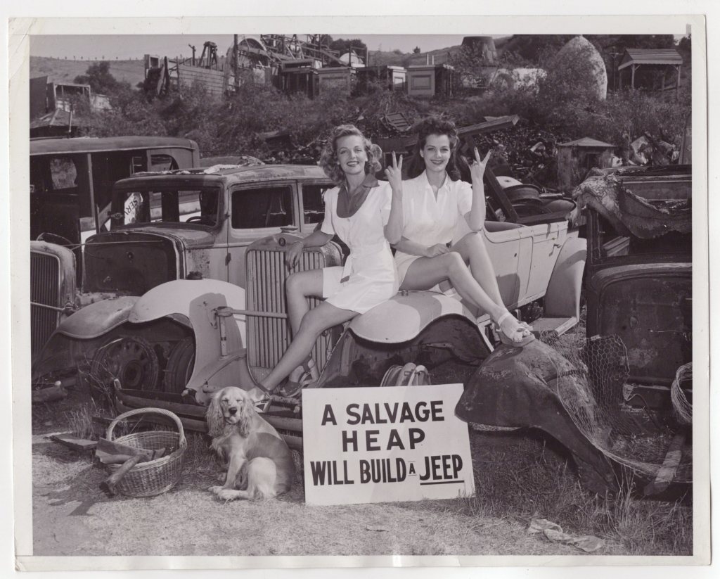This vintage press photo features two Hollywood starlets and a cocker spaniel posing at a Los Angeles junk yard in support of the war effort (World War II). They are sitting on a junked car. A sign in front of them states “A Salvage Heap Will Build A Jeep” and is a reminder to the public that they need to recycle and not waste items and materials that could be useful in fighting the war. The actresses appearing in this photograph are Elyse Knox and Marjorie Lord. The caption on the reverse of this photograph comments that the starlets beautify the salvage heap. Elyse Knox (1917-2012) was an American actress, model and fashion designer. She is known for appearing in “The Mummy’s Tomb” (1942) and the war morale booster film, “Follow The Boys” (1944). Knox was also a popular pin-up girl during the war. She retired in 1949 after acting in 39 films. Marjorie Lord (1918-2015) was an American television and film actress. She played opposite Danny Thomas in the TV series “The Danny Thomas Show”. Her first appearance on Broadway was at age 15 and in total, she was on the Broadway stage four times. The IMDb gives her 79 acting credits. The stamp on the reverse of this photograph indicates that the photo was taken for Acme Newspictures Inc. (Los Angeles Bureau). SOLD