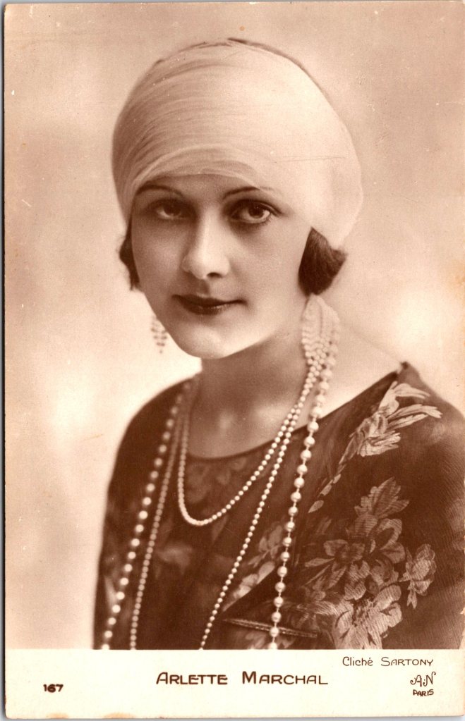 This vintage real photo postcard features French film actress, Arlette Marchal (1902-1984). The IMDb reports that she appeared in 42 films between 1922 and 1951. Marchal was brunette and exotic looking. As a young woman she was very shy and overcame her shyness by entering a beauty contest. She won the contest and one of the judges helped her get a film role. After that appearance, she was in constant demand for both leading and supporting roles in Hollywood silent films. She worked for both MGM and Paramount. She also was a major actress in French and German talkies. Her high in popularity was in the mid 1920’s. The IMDb states that she was most known for “Aux jardins de Murcie” (1923), “Figaro” (1929), “Don Quichotte” (1933), and “The Fighting Pimpernel” (1949). Marchal was noted for her beauty but she also received positive reviews for her acting from American film critics. She retired from acting in 1951 to concentrate on operating her chain of French fashion houses. This postcard was published by Alfred Noyer as part of a series (No.167). Miss Marchal’s photo was taken by the Sartony studio (Paris). SOLD