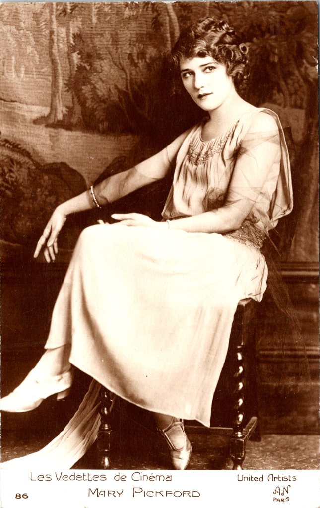 Mary Pickford (1892-1979) was a Canadian-American actress and one of the most influential figures in early Hollywood. She was often referred to as “America’s Sweetheart”. She was a pioneer of silent film and a co-founder of the film industry as we know it today. Pickford’s career began in childhood when she performed in theater productions in Canada and the United States. By the early 1900s, she transitioned to film, working with director D.W. Griffith at Biograph Studios. Her delicate beauty and expressive acting quickly made her a fan favorite, setting her apart in an era when exaggerated stage-style performances dominated silent films. During the 1910s and 1920s, Pickford became one of the highest-paid and most beloved actresses in the world. Starring in films such as Rebecca of Sunnybrook Farm (1917), Daddy-Long-Legs (1919), and Pollyanna (1920), she was known for playing wholesome, spirited young women. Her curly hair and signature on-screen innocence became iconic, but she was also a savvy businesswoman who understood the power of her brand. Pickford was not only a star but also a trailblazer in the film industry. In 1919, she co-founded United Artists alongside Charlie Chaplin, Douglas Fairbanks (her then-husband), and director D.W. Griffith. This revolutionary move allowed filmmakers to control their own productions rather than rely on major studios, changing the industry forever. As the film industry transitioned to “talkies,” Pickford retired from acting in the early 1930s, though she continued to produce films. Her contributions earned her an honorary Academy Award in 1976 for her lasting impact on cinema. Mary Pickford’s influence extends beyond her films. She helped shape the star system, paved the way for women in Hollywood, and co-founded the Motion Picture Relief Fund to support struggling actors. She remains an enduring symbol of early Hollywood glamour and innovation. Mary Pickford was born into a working-class family in Toronto, Canada. Her father, John Charles Smith, was an alcoholic who struggled to provide for the family and died from a workplace accident when Mary was just six years old. Her mother, Charlotte Hennessey Smith, was left to raise Mary and her two younger siblings, Lottie and Jack, on her own. To support the family, Charlotte encouraged her children to enter acting, and Mary began performing in theater at a young age. She soon became the family’s primary breadwinner, and her siblings, Lottie Pickford and Jack Pickford, also pursued film careers. Pickford transitioned from theater to film in the early 1900s, quickly rising to fame with her expressive acting and wholesome on-screen persona. By the 1910s and 1920s, she was one of the most recognizable stars in the world, earning the nickname “Queen of the Movies.” She also helped establish the Academy of Motion Picture Arts and Sciences. Mary Pickford was married three times. Pickford’s first marriage was to silent film actor Owen Moore (1911-1920). Her second and most famous marriage was to fellow silent film actor, Douglas Fairbanks (1920-1936). Her third marriage was to actor Charles “Buddy” Rogers (1937-1979). After retiring from acting in the early 1930s, Pickford focused on producing films and philanthropy. She became more reclusive in her later years, struggling with alcoholism and health issues. Today, she is remembered as a pioneering force in cinema history. Pickford is featured on this postcard. She is seated gracefully on a carved wooden stool, exuding elegance and poise. She is dressed in a flowing, light-colored gown with delicate embellishments on the bodice and sheer fabric draping over her arms. Her signature curls frame her face, a defining feature of her “America’s Sweetheart” image. She wears a subtle yet confident expression, her eyes gazing slightly to the side with a soft, introspective quality. Her arms are relaxed, with one hand resting gently on her lap and the other elegantly extended. Her accessories include a bracelet on her wrist and a ring on her finger, adding to her refined look. The backdrop behind her is a richly textured tapestry, possibly depicting a pastoral scene. This postcard was likely produced in the 1920s, during the height of Pickford’s career. It is numbered 86 and is part of a larger collectible series showcasing cinema stars of the era. This vintage postcard is part of a series titled Les Vedettes de Cinéma (translated as The Stars of Cinema), and it was published by Alfred Noyer (Paris,France), in collaboration with United Artists, the film distribution company that Pickford co-founded. The back of the postcard identifies the publisher as Cinémagazine – Edition and states that it was Made in France / Fabriqué en France, indicating its European origin. (SOLD)