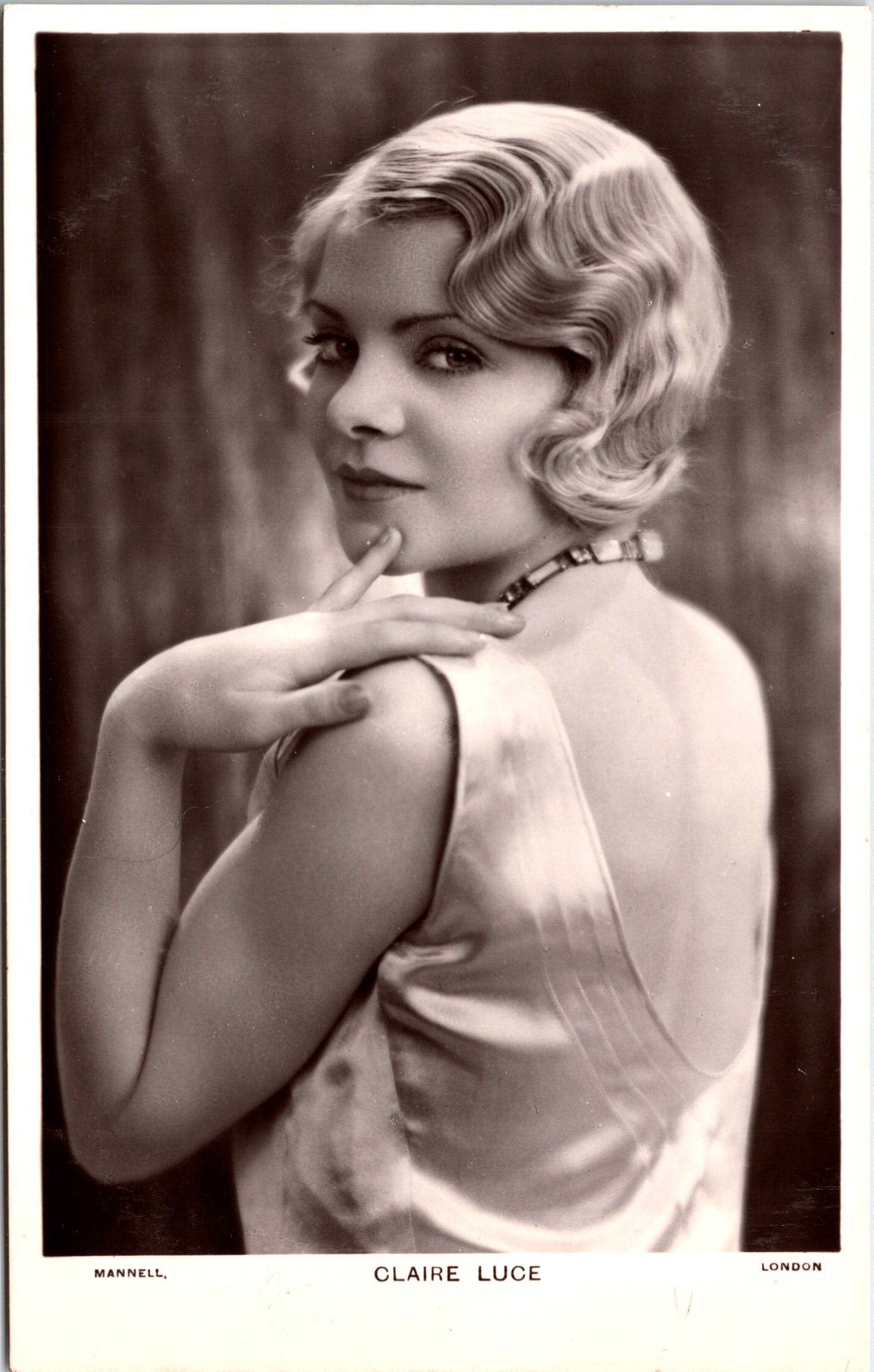 This vintage portrait postcard captures the elegance and sophistication of Claire Luce, a celebrated American stage and screen actress known for her work in theater and Hollywood during the early to mid-20th century. Photographed by Mannell Studio, London, this stunning black-and-white image exudes the classic glamour of the era, likely from the 1920s or 1930s. In this portrait, Claire Luce is seen wearing a sleek satin gown with a low-cut back, reflecting the timeless fashion of the Art Deco period. Her delicate necklace adds a touch of refinement, while her softly curled platinum blonde hair is meticulously styled in the distinctive finger waves that were highly fashionable during that time. Her expression is both confident and alluring, with a slight smile and a captivating gaze that suggests both poise and mystery. She poses gracefully, her fingers resting near her chin in an elegant yet relaxed manner, enhancing the overall sophistication of the composition. Born in 1903, in Syracuse, New York, Claire Luce became a renowned actress known for her work on both stage and screen. She rose to prominence in the 1920s and 1930s, particularly for her performances in Broadway productions. One of her most notable roles was in Gay Divorce (1932), where she starred alongside Fred Astaire. This production later inspired the classic film The Gay Divorcee (1934), though her role in the film was played by Ginger Rogers. Luce also made a mark in Hollywood, appearing in films such as Up the River (1930), The Cohens and the Kellys in Africa (1931), and Over She Goes (1937). However, her true passion remained the stage, and she continued to shine in numerous theatrical productions, both in the United States and the United Kingdom. Aside from her acting career, Luce was admired for her beauty, grace, and sophisticated sense of style. She was often photographed in elegant gowns, embodying the glamour of the Golden Age of Hollywood and theater. Claire Luce was known for her dedication to her craft, and while she had several notable relationships, she was never widely publicized for her personal life. She married Clifford Warren Smith, an English businessman, though details about their marriage remain relatively private. . Claire Luce’s contributions to theater and film continue to be remembered by classic cinema enthusiasts and theater historians. Her connection to Fred Astaire and the Broadway stage solidifies her place in entertainment history. George Mannell (London) is the photographer who took this postcard’s photo portrait. The postcard is relatively uncommon.