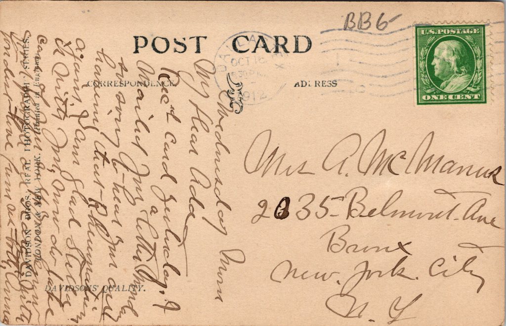 This vintage real photo postcard features the Oriental Hotel, which was located in Dallas, Texas. The street scene includes a working trolley. The hotel opened in 1893 and was referred to as “Field’s Folly” because of it’s extravagant elegance. Field was a real estate man active in Dallas in the 1870’s through the 1890’s. He was also a talented promoter of his city. The hotel was demolished in 1924 to clear the way for the construction of a new hotel. This postcard was published by Davidson Brothers as part of a series (no.1189 A). The card was postmarked in Dallas in 1912. SOLD