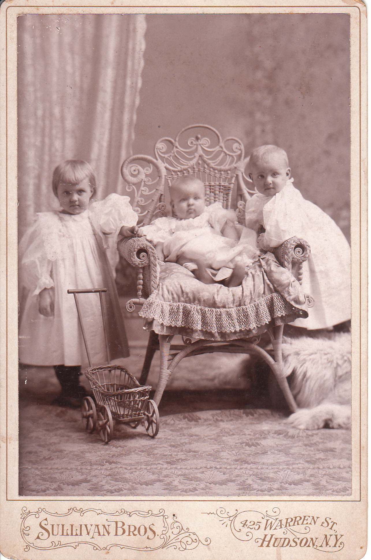 The Sullivan Brothers studio produced this cabinet card featuring three very young children. These kids are very close in age but are probably siblings. They are wearing gowns and the oldest child is posed behind a wood stroller toy. The back of the cabinet card has an inscription to “Aunt Rachel”. Frederick and Alfred H. Sullivan operated their studio in Hudson, New York. To learn more about them and to view more of their images, click on the category “Photographer: Sullivan Brothers”.