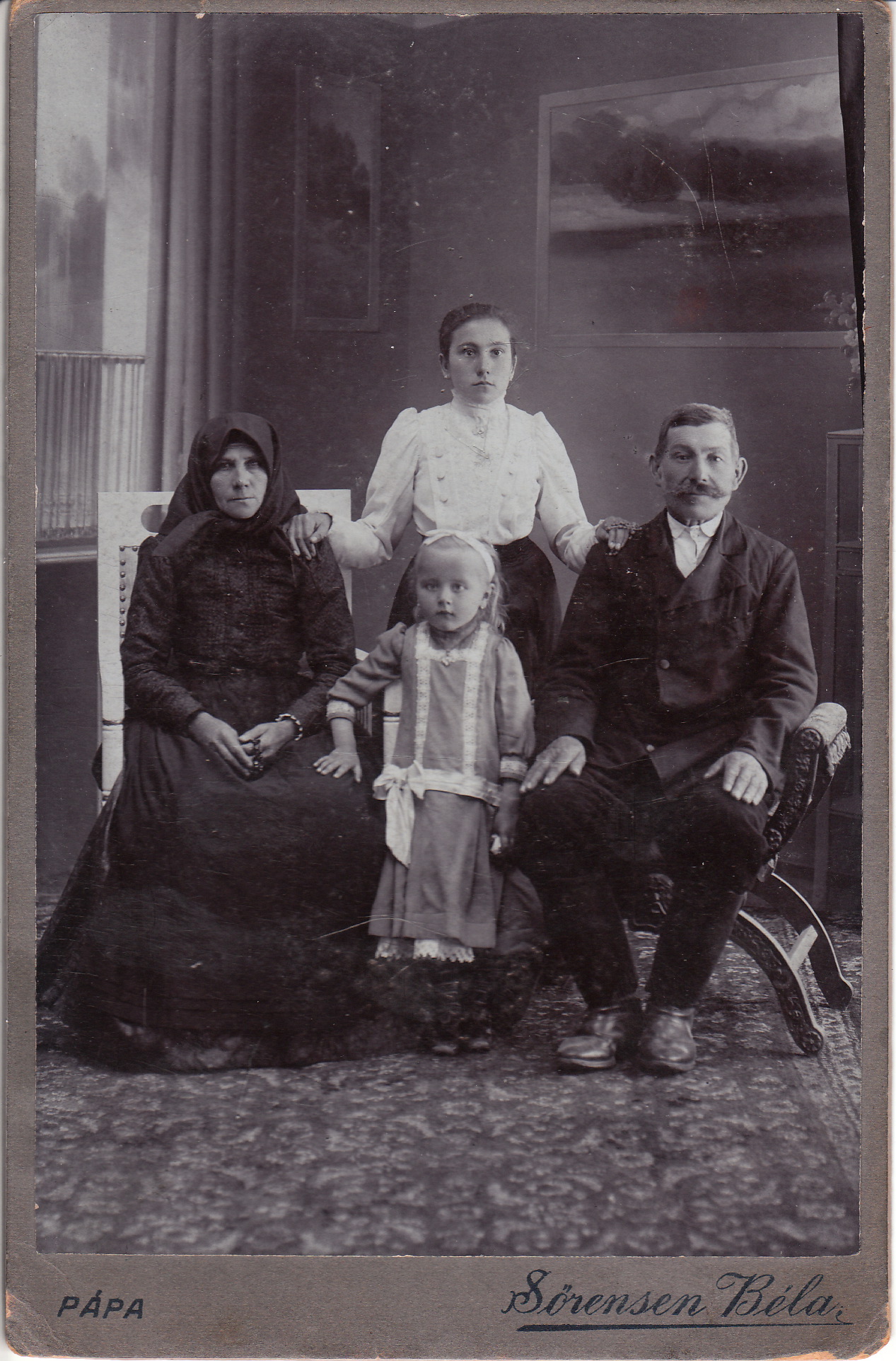 This family portrait cabinet card was photographed by Sorensen Bela in the city of Papa, Hungary. Due to the age of the seated man and woman, it is difficult to determine the family constellation. Is this a photograph of parents with two daughters? Perhaps its a photograph of a set of parents, their daughter, and their granddaughter? The community of Papa is a historical town in northeast Hungary. The town is noted for its baroque architecture and for being the center of the reformed faith in Transdanubia. In addition, Papa was the third to largest Jewish community in 19th century Hungary.