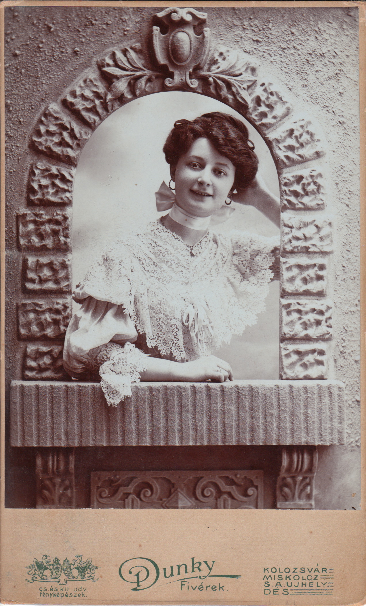 A pretty woman wearing a fancy dress peeks through a window in a European photography studio. It is unclear whether the studio was located in Hungary or Romania. The photographer of this image is Fiverek Dunky. The reverse of the cabinet card advertises that the photographer won photography medals from exhibitions in London and Paris.