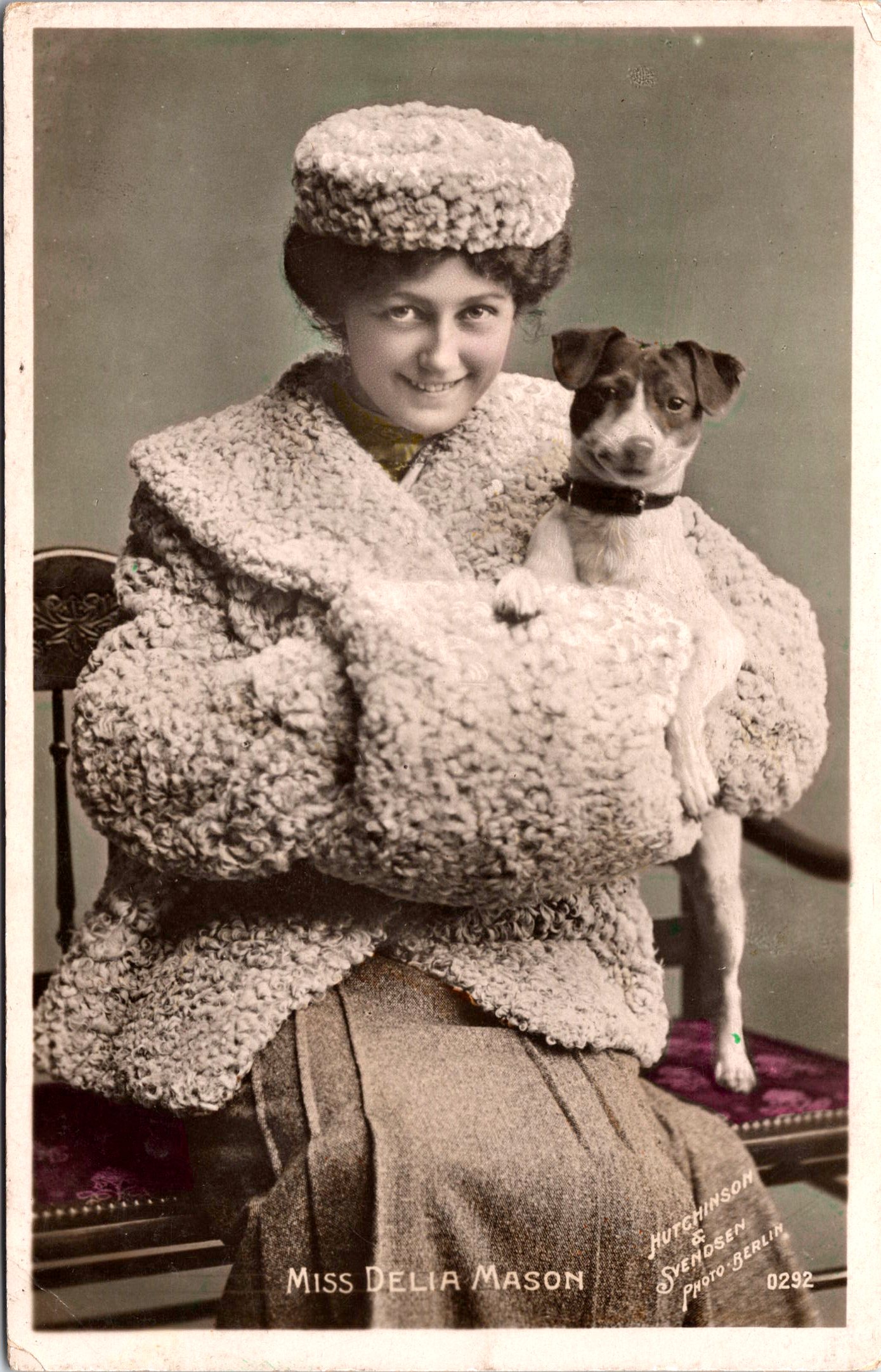 This vintage real photo postcard features pretty stage actress and singer, Delia Mason (1880-1980). She is posed with a dog that appears to be a Jack Russell Terrier. There is little biographical information about her readily available online. She was a native of Coventry, England. There are seven portraits of Mason that can be found in Britain’s National Portrait Gallery. Her first professional appearance was in “Three Little Maids” (1902) at the Apollo Theatre in London.