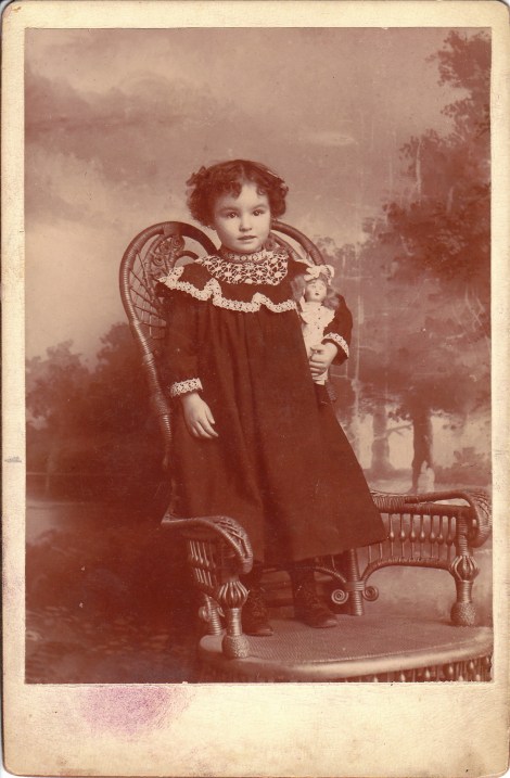 This cabinet card features a very cute, curly haired,   little girl standing on a chair. She is clutching her doll and carefully posing the doll for the photograph. She is wearing an adorable dress. The fabric at her collar matches the fabric on the cuffs of her sleeves.  The little girl is identified on the reverse of the card as “Mrs. J. J. Joseph”.  A faded back stamp identifies the photographer as L. McLean, and his studio as being located in Idaho Springs, Colorado. Lachlan McLean was listed in the Clear Creek County Business Directory (1890). His work was well respected and a biography has been written about his life, Secure the Shadow: Lachlan McLean, Colorado Mining Photographer (1980). This cabinet photograph was taken only a few decades after the founding of Idaho Springs. The town was established by prospectors in the early days of the Pikes Peak Gold Rush. Idaho Springs was the site of the first significant gold discovery in Colorado.  (SOLD)