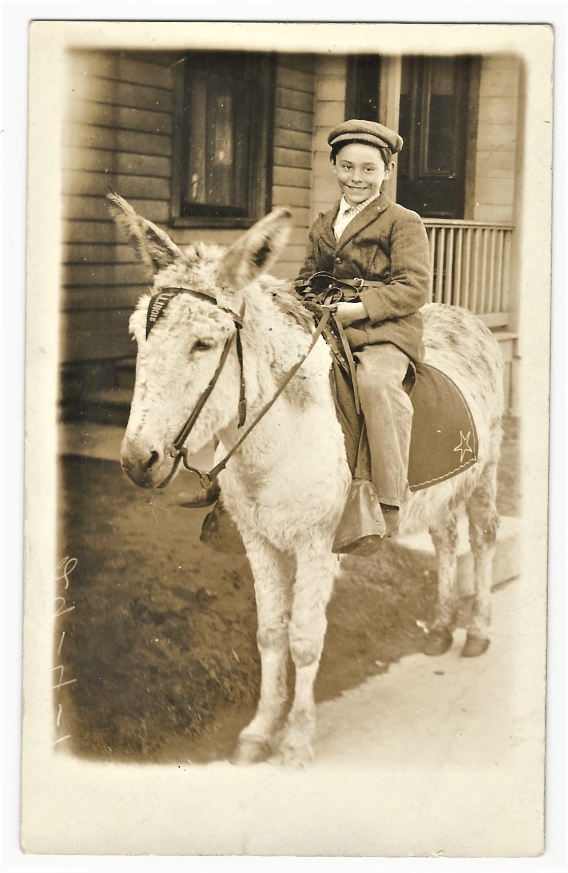 This vintage real photo postcard provides a “feel good” impact on it’s viewers. A young well-dressed boy rides a tired looking donkey and he is wearing a smile that extends from ear to ear. He seems to be having the time of his life and his smile is infectious. A nice smile serves people well in life. Marilyn Monroe must have been in agreement about the importance of smiling when she said “A smile is the best makup any girl can wear”. Note that the donkey has a pennant hanging on his forehead. The pennant has “Illinois” printed on it. We can probably posit that this photo was taken in the “Land of Lincoln” (Illinois). This postcard has an “AZO” stamp box indicating that it was produced sometime between 1904 and 1918. The postcard is in very good condition (see scans).