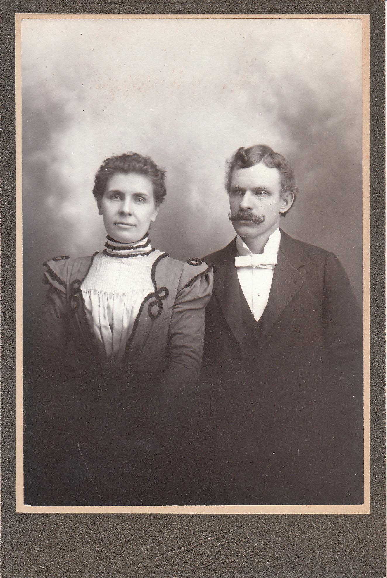 This photograph features an attractive couple posing for a photographer in Chicago, Illinois. The photographer’s last name is Banks and his studio was located at 2445 Kensington Avenue. The couple is very well dressed and share very serious expressions.The gentleman has a terrific mustache which curls at both ends. The couple are unidentified and no biographical information was found about the photographer.