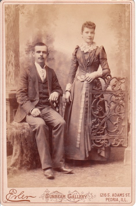 A young couple poses for their portrait at the Sunbeam Gallery in Peoria, Illinois. The man and woman in this photograph are showing signs of happiness. Both of them are exhibiting a half smile rather than the typical intense expressions generally seen in cabinet card photography. The pair appear to be resting by a swinging wrought iron gate. The photographer of this image is Max Erler (about 1857-1936). He is listed in the US censuses of 1880 through 1920 as a photographer. He began his own photography business in 1881 and married his wife, Jennie Harris Erler (about 1861-1934). in 1883.