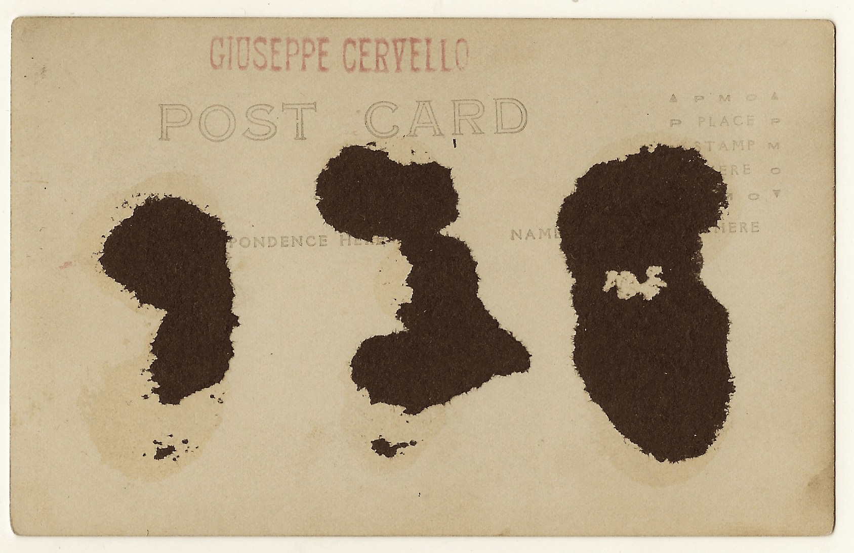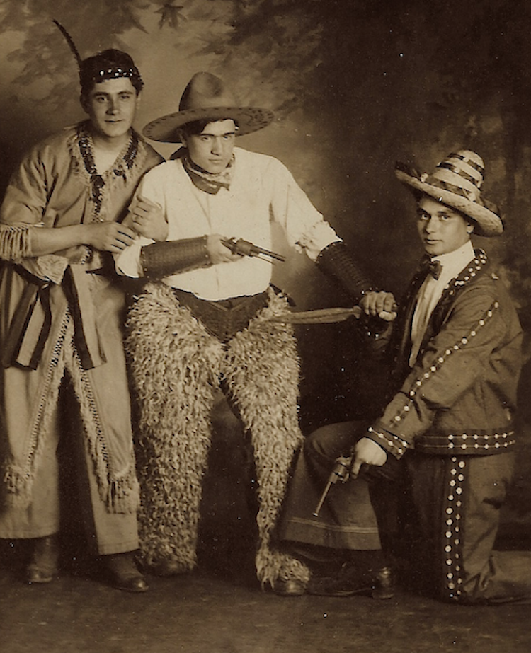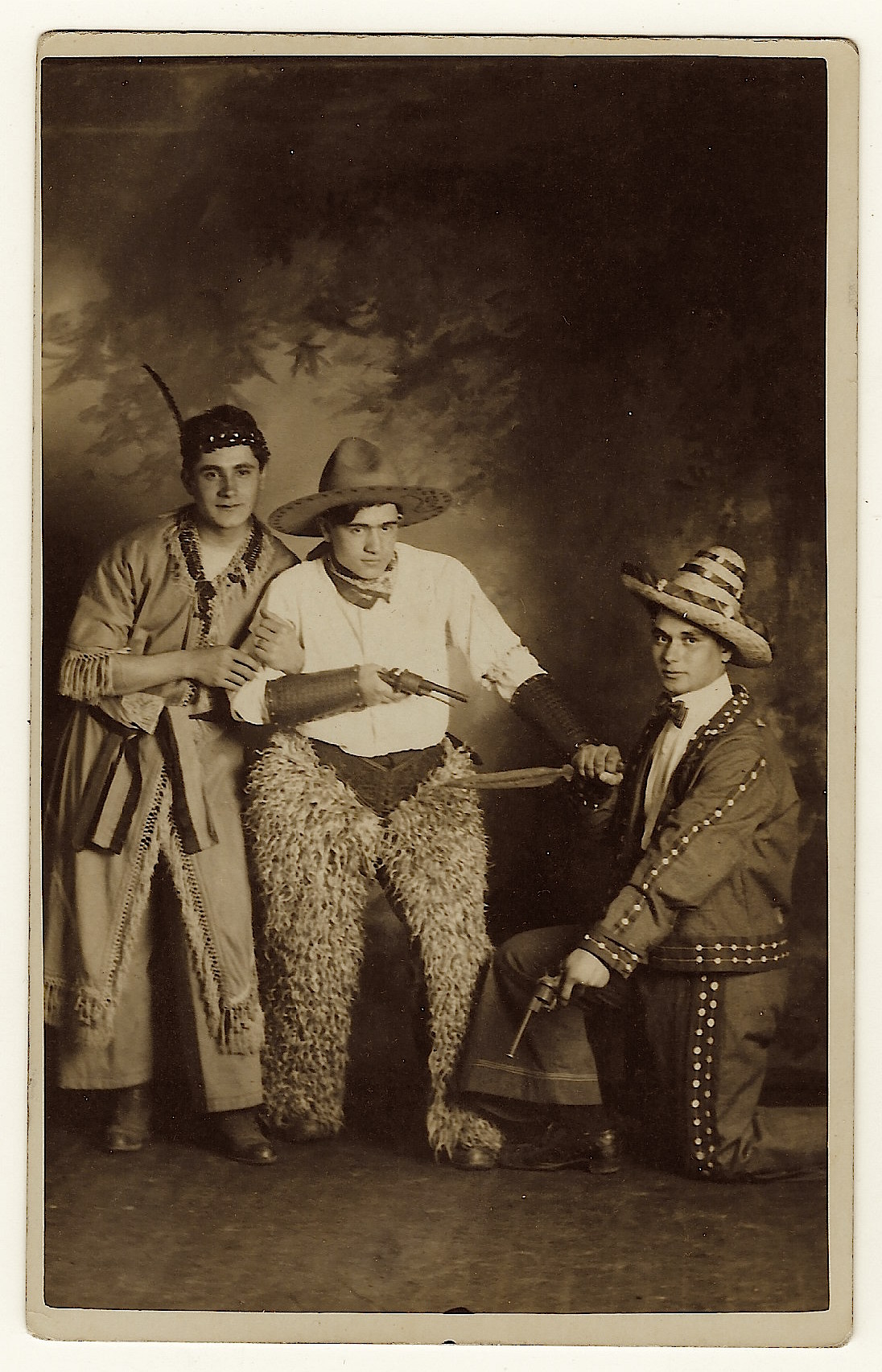 Three young men have a great time posing for their photo at a photo studio. They are in terrific costumes and two of the three subjects have drawn pistols. The Indian has a feather in his hair, the cowboy is wearing wooly chaps, and the Mexican bandito is wearing a sombrero. The reverse of this vintage real photo postcard has a stamped name, “Giuseppe Cervello”. Cervello is likely the photographer of this image. This postcard was once a resident of a scrap book or postcard album as can be seen by the black page remnants affixed to the reverse of the card. The stamp box indicates that this postcard was published between 1907-1915. (SOLD)