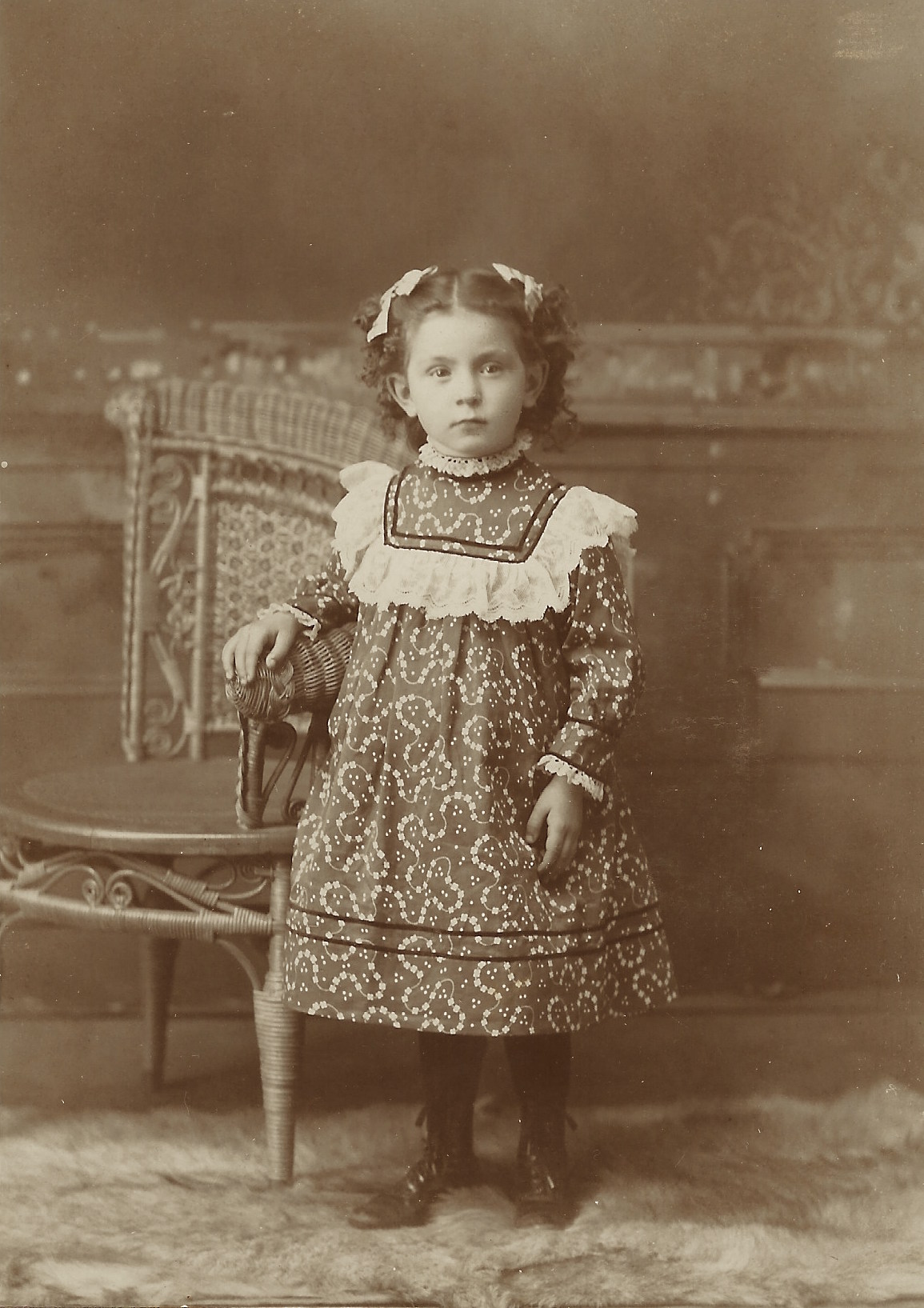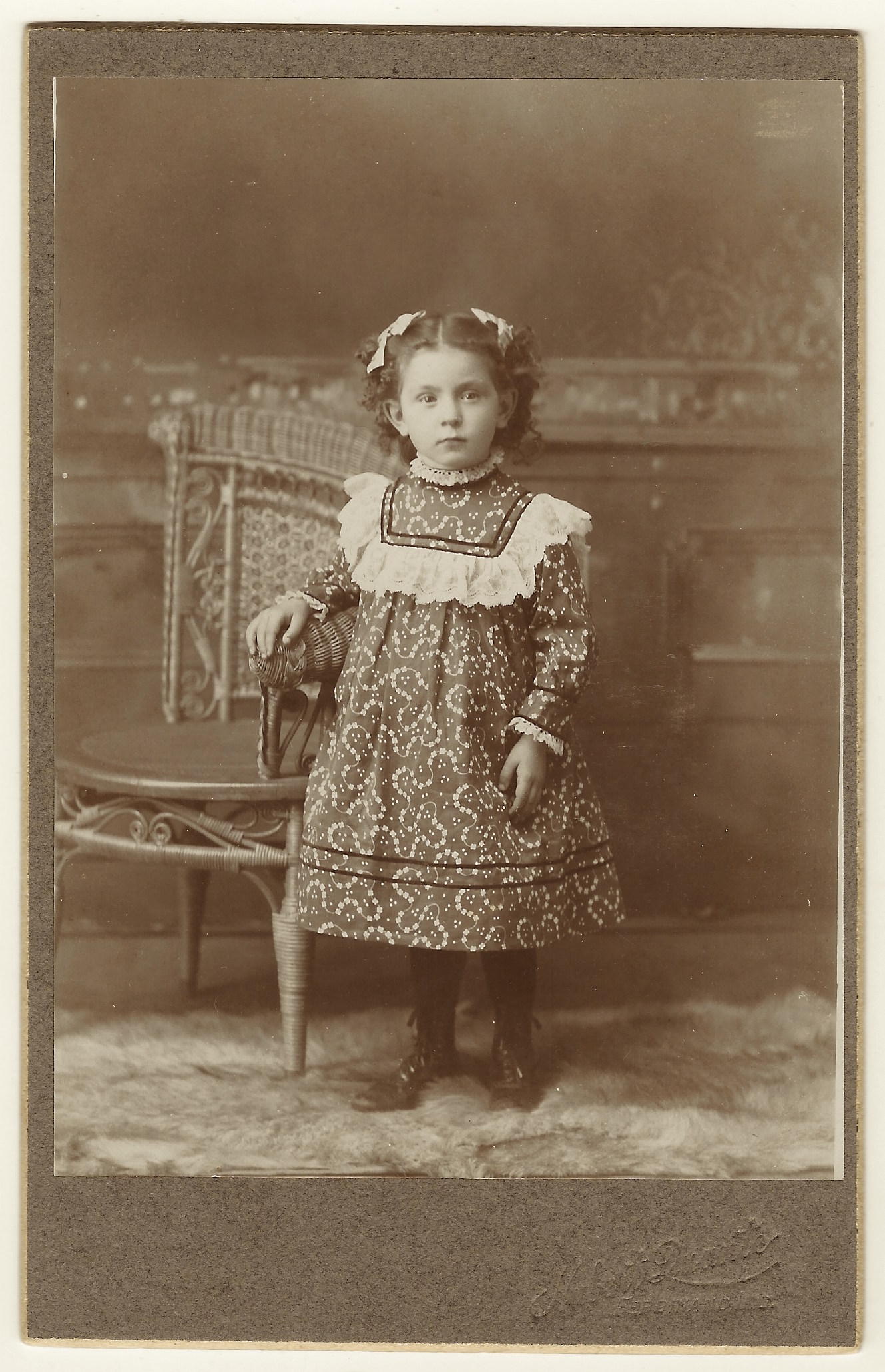 This vintage photograph features a most adorable little girl wearing a cute dress. Printing on the reverse of the photograph reveals that this portrait was taken by Hunt’s Art Studio which was located in Goodland, Indiana. I want to live in a town named Goodland. A place where everyone is “good” and everything that happens in one’s life is “good”. Research reveals that Goodland, which is probably a lovely town, does not fit the bill for being the location of “all encompassing goodness”. In fact, the town, which originated in 1861, is named Goodland because the soil is good. Writing on the verso indicates that the little girls last name may be “Allen”. Investigating the photographer was unproductive. Although there were a number of photographers with the last name of “Hunt” operating in Indiana during the post cabinet card era, I could not find one who worked in Goodland.