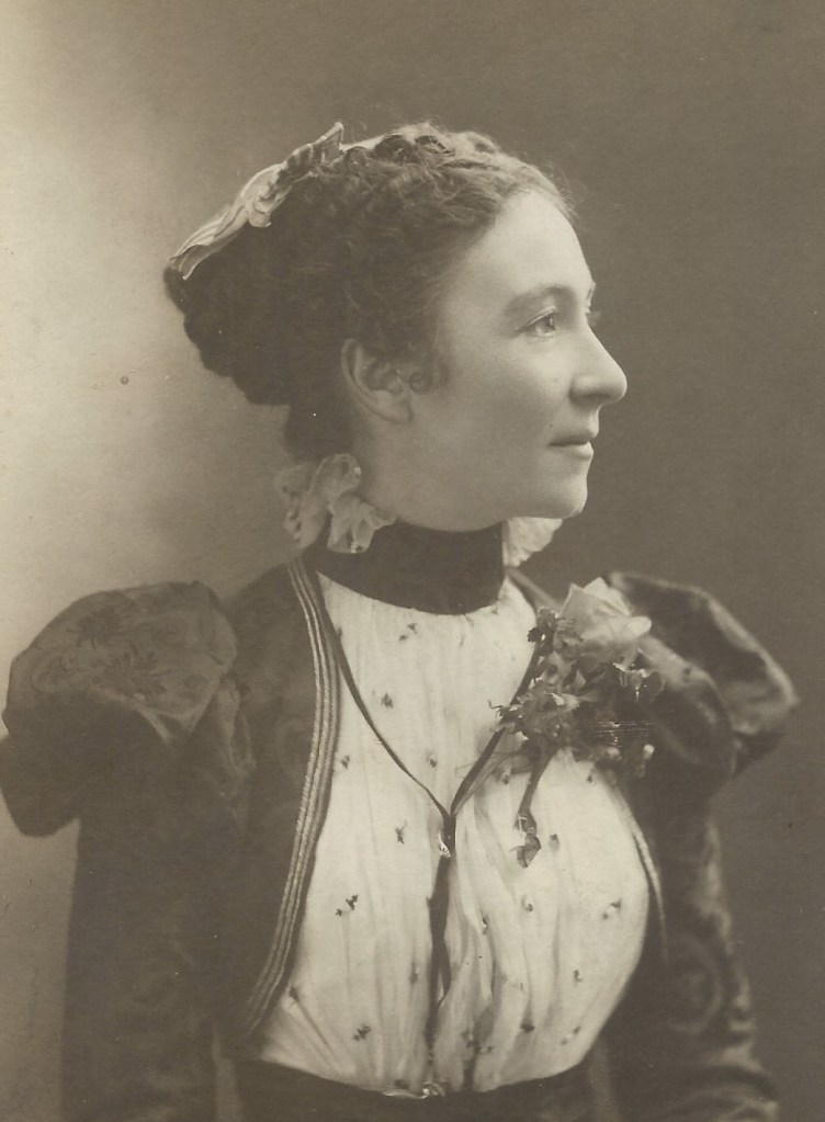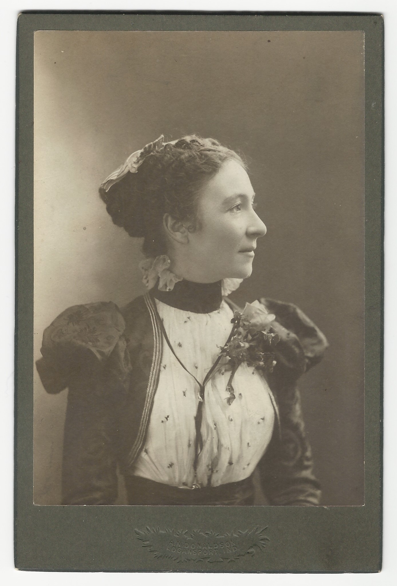 This post cabinet card era portrait features a profile view of a pretty woman. She looks quite proper in her fashionable clothing and with her hair gathered atop her head. She is wearing flowers as well as a lace-like necklace hanging down the front of her dress. I can’t decide it’s purpose but perhaps it is to hold a pocket watch. In fact, I believe I may see a timepiece peeking out from the top of her skirt. This image comes from the A. N. Donaldson studio in Logansport, Indiana. He did a terrific job with the soft backlighting seen in this photograph. Research revealed some biographical information about the photographer Albert Newton Donaldson (1841-1906). He settled in Logansport in 1867. Earlier, he had participated in the civil war. In 1861 he entered the service as a private and after some time left the service as a corporal. He served in Indiana’s 10th Infantry (Company H). One source reports that Donaldson deserted from his unit on 6/15/1862 at Corinth, Mississippi. A second source never mentions the desertion. The 1880 US census revealed that he was married in 1865 to Susan E Donaldson. The 1880 census, as well as the 1900 census, listed his occupation as being a photographer. This vintage photograph is in very good condition (see scans).