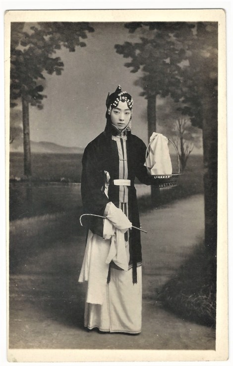 This vintage real photo postcard begs some answers, but I’m stumped. I have never seen the type of clothing displayed on this card before; despite my exposure to a multitude of international postcards. This interesting studio portraiture features a pretty Asian woman dressed in some unusual garb. It appears to be formal traditional clothing. I do not know which culture that this dress represents. I am hypothesizing that woman is Japanese. However, the previous owner of this postcard thought the woman may have been from Indonesia. The owner’s guess is written on the reverse of the card. The woman in this photo is holding a basket in one hand and an object I can’t identify in the other hand. There is an AZO stamp box on the back of the postcard. It reveals that this card was produced sometime between 1910 and 1930. SOLD