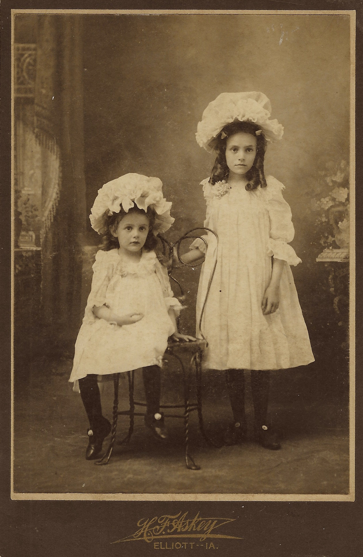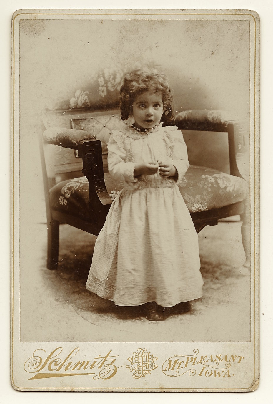 A cute little girl with curly hair poses in a studio created field of daisies for photographer Sim Mould. The studio was located in Baraboo, Wisconsin. The girl is wearing a dress wth a lace collar and has a flower pinned to the front of her dress. An inscription on the reverse of the cabinet card indicates that the child’s name is Hattie Acot. Unfortunately, no biographical information could be found about her. The photographer, Mr. Mould is mentioned in a number of photographic journals. He placed an ad for his studio in a book about Sauk County, Wisconsin (1891). The Photographic Times (1898) reports on his appointment to a lobbying committee of the Photographers Association of Wisconsin. The Encyclopedia Dubuque (1911) reveals that Sim Mould operated a photographic studio at 107 Main Street in Dubuque, Iowa. The town of Baraboo is situated on the Baraboo river. The town was settled by Abe Wood and originally called Adams. In 1852 it was renamed Baraboo. In the town’s early history it became the home of several sawmills. In the nineteenth century the town served as the headquarters of several circuses, including Ringling Brothers. Baraboo became known as “Circus City”. This cabinet card portrait is in very good condition (see scans).