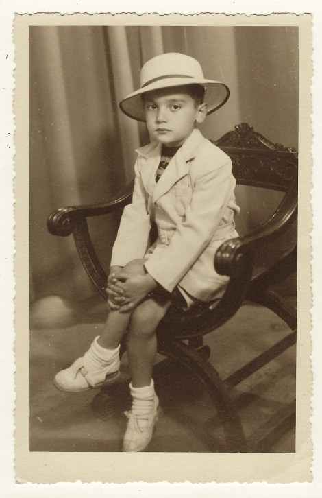 This vintage photograph features an adorable little boy. He is very fashionable and is wearing a terrific Panama hat. His expression is priceless. This photo was taken in Istanbul, Turkey in 1949. I can not identify the language written on the reverse of the photograph. The official language of Turkey is Turkish but there are many other ethnic groups living in the nation. Other prevalent languages include Arabic and Zazaki. This photograph measures about 5″ x 3 1/14″. (SOLD)