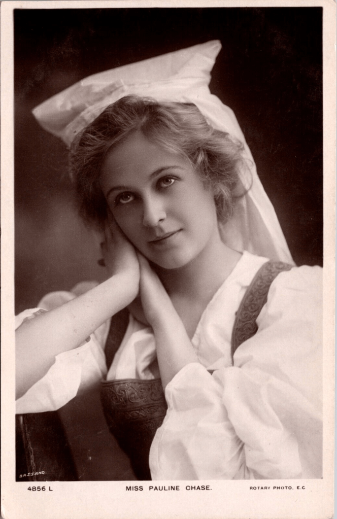 Postcard 4 features Chase wearing an interesting lace hat and she has a sweet, pure, and innocent appearance. This postcard was published circa 1909, the date of the cards postmark. The card was published by Rotary Photo as part of a series (No.4856L). Miss Chase’s photograph was taken by the Bassano studio. (SOLD)