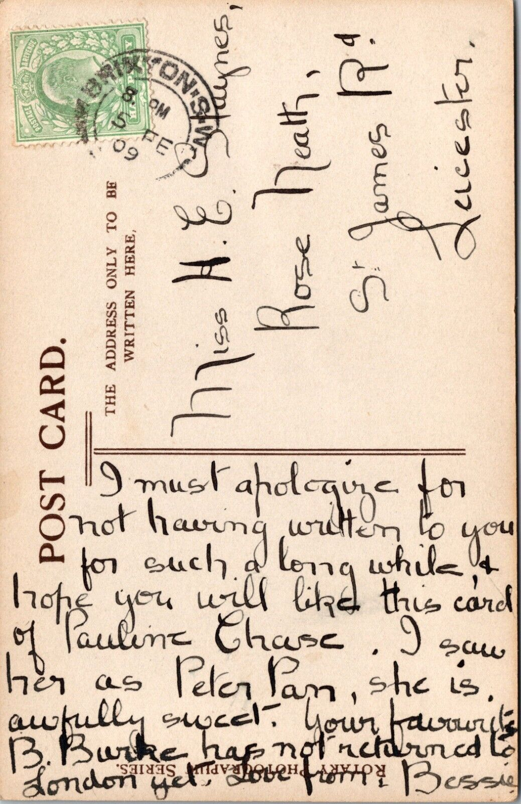 This vintage real photo Postcard 1 features pretty American actress and dancer, Pauline Chase (1885-1962). She was a regular performer both in the United States and the United Kingdom. She is especially known for her extended starring role in the British production of “Peter Pan, The Boy Who Wouldn’t Grow Up”. Her nickname was the “Pocket Venus of New York”. She was born in Washington D.C. and attended school in New York. She began acting when she was just fifteen years old. In 1901, producer, Charles Frohman recruited her to play in the London production of “The Girl From Up There”. She was just 15 years old. Upon her return to the US, she created a sensation as the “Pink Pajama Girl” in “The Liberty Belles”. She played one of the “lost boys” in the debut of Peter Pan (1904) in London. In 1906 she was chosen by producer, Charles Frohman, and playwright, J. M. Barrie, to play the title role in the production (1906-1913). This role brought her much fame and financial security. While in England, over the years, Chase developed quite a following. Charles Frohman had become her friend and mentor. Chase was a social beauty with many influential friends and admirers. She was a member of the socially elite and lived an extravagant life style. In 1913, Chase retired from the stage to marry a banker. The pair had three children. In 1916, Chase came out of retirement to play in her one and only movie appearance. There are 52 portraits of Chase in the National Portrait Gallery. The film “The Real Thing At Last” was a satirical film, based on MacBeth, written by Barrie. This postcard has a 1907 postmark. The card was published by Rotary Photo as part of a series (No.4083O). Miss Chase’s photograph was taken by the Hutchinson & Svendsen studio. (SOLD)