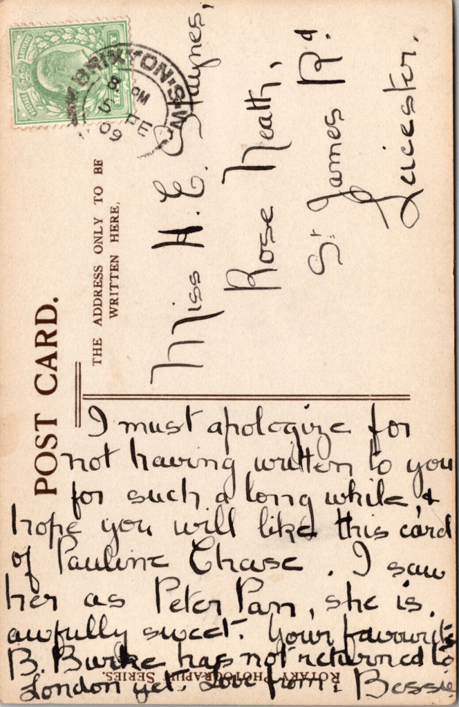 Postcard 3 has a 1907 postmark. The card was published by Raphael Tuck & Sons as part of a series (No.T30). Miss Chase’s photograph was taken by the Johnston & Hoffmann studio. (SOLD)