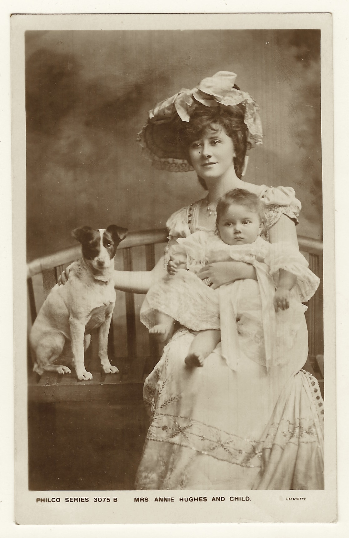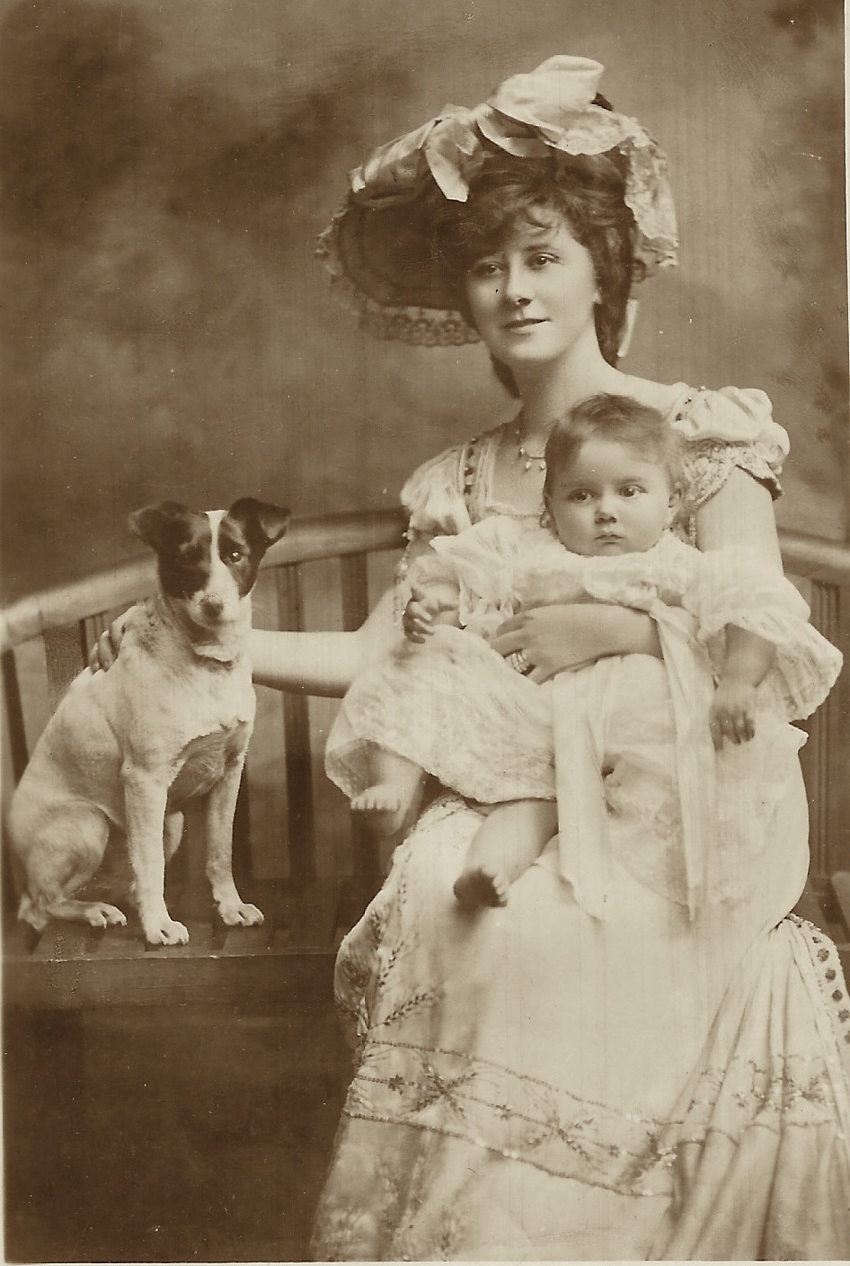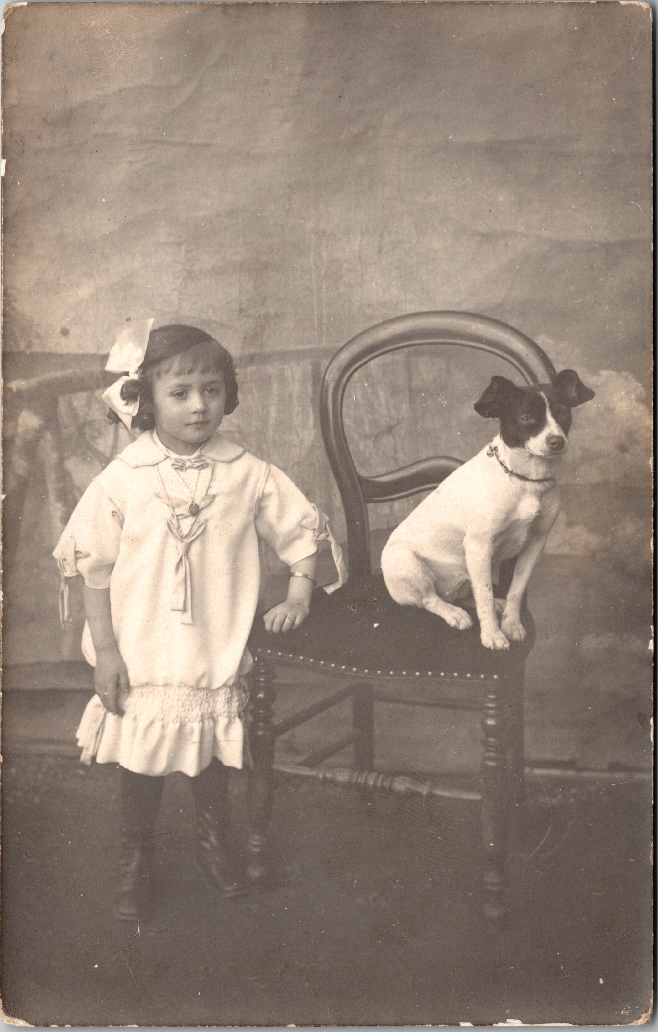 This vintage real photo postcard features pretty stage actress and singer, Delia Mason (1880-1980). She is posed with a dog that appears to be a Jack Russell Terrier. There is little biographical information about her readily available online. She was a native of Coventry, England. There are seven portraits of Mason that can be found in Britain’s National Portrait Gallery. Her first professional appearance was in “Three Little Maids” (1902) at the Apollo Theatre in London.