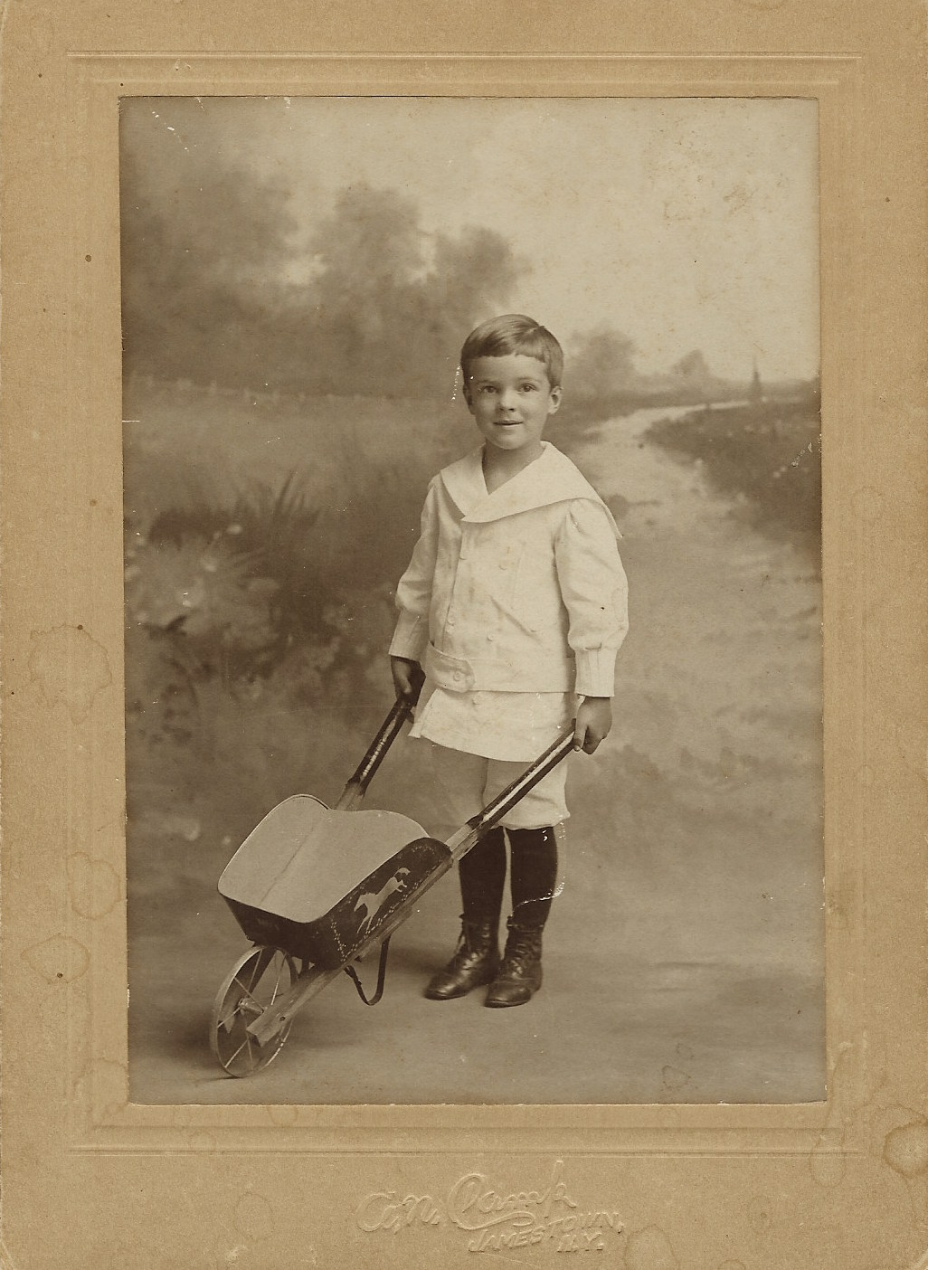 This vintage real photo postcard features a studio portrait of a trombone player. He is wearing a band uniform and is holding the trombone on his lap. Writing on the reverse of the postcard indicates that his name Abdulla Adams and that he wrote the card from Jamestown, New York in 1918. Preliminary research reveals that there was an “Abdulla Adams” that lived in Jamestown. HIs draft card (1917) and the Jamestown City Directory (1922) provides some background information about this young man. Adams was born in Corytso, Albania in 1897. He was twenty-one years old when the photo on the card was taken. The city directory reveals that Adams was employed as a finisher in a furniture factory. The AZO stamp box on the reverse of this postcard indicates that the postcard was published between 1904 and 1918. SOLD