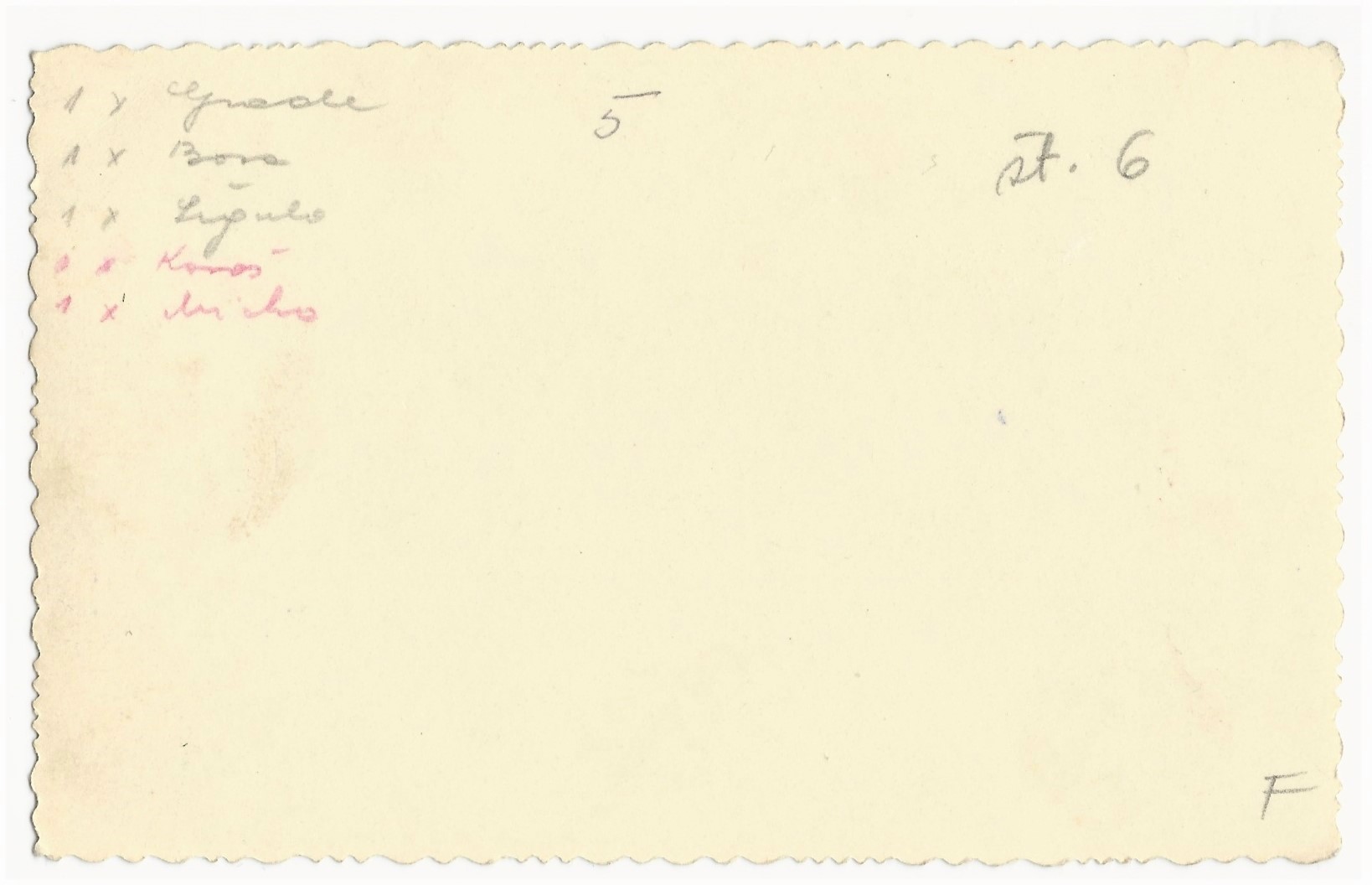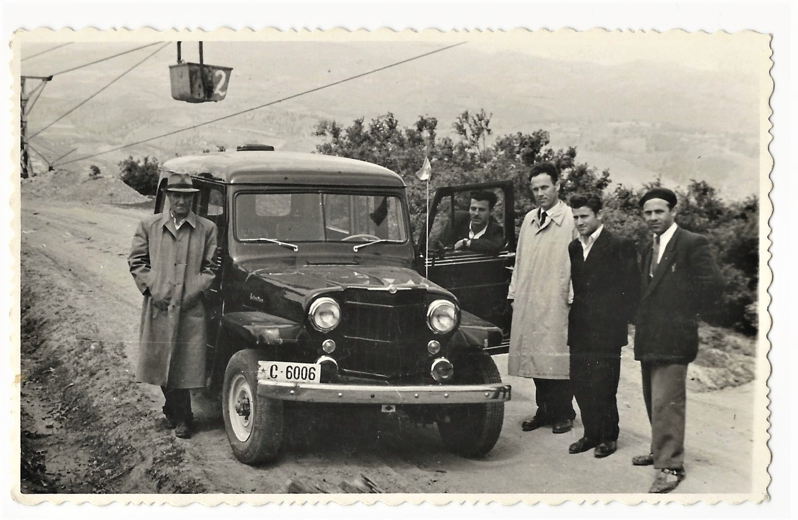 I would love to know the story behind this vintage postcard. Five men are standing by a Willys Jeep or Jeep-like vehicle. The car is on a dirt road. The men are posed in an odd manner. There are four men on one side of the automobile and a single man on the other side of the vehicle. Is the lone man a hired driver? Are the four other gentleman traveling together for business? There are mountains in the background. A cable car type system is in the near background. I wonder what was being transported by the cable cars? There is a small flag above the hood of the jeep. Although the design of the flag is not fully visible, the flag appears very similar to the flags flown by Serbia and some of it’s neighboring countries. The previous owner of this photograph has advised me that this photo was taken in Serbia. An inscription on the reverse of the photograph lists five names that most likely belong to the five men in the photo. This photograph appears to be from the 1950’s. It is in very good condition (see scans).