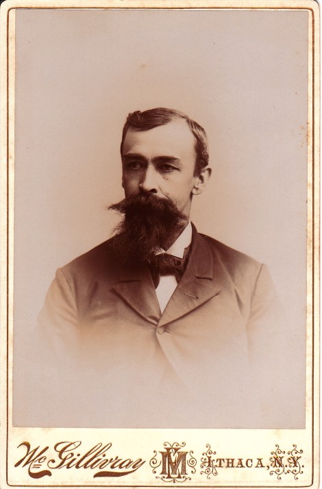 The Cabinet Card Gallery has discovered another mouthless man. This gentleman posed for his portrait at the McGillivray studio in Ithaca, New York. The studio was located at 28 & 30 East State Street. Those that know Ithaca winters can imagine this gentleman trudging through mounds of snow in frigid temperature with a frozen beard and mustache. To view other interesting beards an mustaches, click on the category “Beards (Only the Best)”. Research found some information about the photographer of this image. Ellsworth McGillivray was born in Caroline, NY in 1862. He attended the Ithaca school system and after he left school he became a painter. In 1881 he began his career as a photographer. He worked for photographer George Stanley for two years and then was employed by E. D. Evans for six years. He then worked in Cortland, NY for one year before returning to Ithaca in 1890 and buying the Forest City Art Gallery. McGillivray was married to Jessie L Shaw of Albion, NY.
