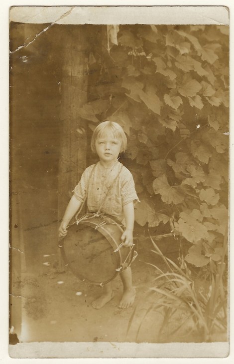 This endearing vintage real photo postcard captures a barefoot little boy and his drum. He is looking quite proud and serious. The drum does not look like a toy. Perhaps it saw some action during the civil war. The reverse of the postcard has an inscription revealing that the child is named John M. Norris and that he is two years old. The inscription also states that this photograph was taken in 1914. The AZO stamp box offers a confirmation of the date. This stamp box was utilized between 1904 and 1918. This postcard was purchased near Austin, Texas. SOLD