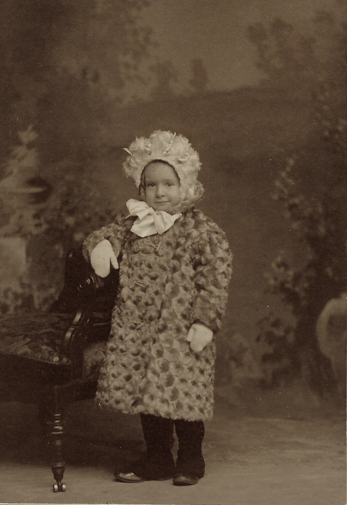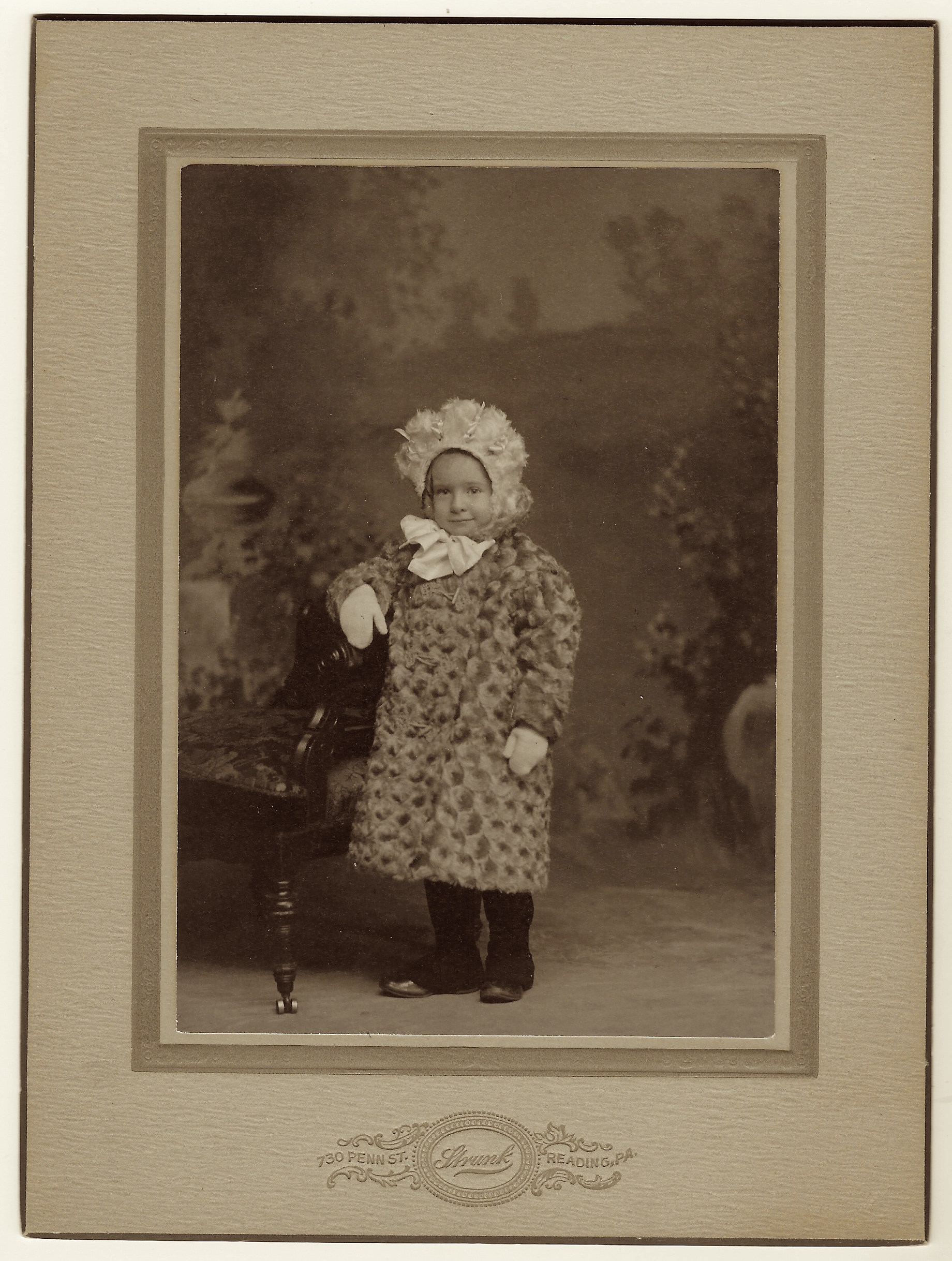 This vintage photograph features a cute little girl all bundled up in her winter outdoor clothing. Her coat and hat are unique by todays standards. She is wearing gloves and a nice grin. This photograph was taken by the studio belonging to John D. Strunk. He was a talented and prolific photographer who operated a studio in Reading, Pennyslvania. After adding this photograph to the Cabinet Card Gallery, the site will display fifteen of his images. According to evidence gathered in preliminary research, he worked as a photographer between 1888 and 1910. This photograph measures about 5 3/4″ x 7 3/4″ and was taken during the last half of his career. An additional aspect of this photograph is that there is a ghost image on it’s reverse.