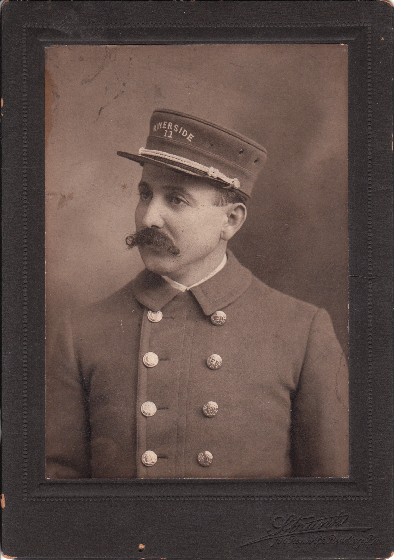 This photograph captures a Riverside Fire Department member in his dress uniform. The photographer is John D. Strunk and his studio operated in Reading, Pennsylvania. To view other photographs by Strunk, click on the cabinet card gallery category “Photographer: Strunk”. To view other portraits of firemen, click on the category “Firemen and Policemen”.The fireman seen in this portrait wears a cap with an insignia stating “Riverside” and “11”. He is also wearing special fire department buttons on his jacket. He sports a handsome mustache.