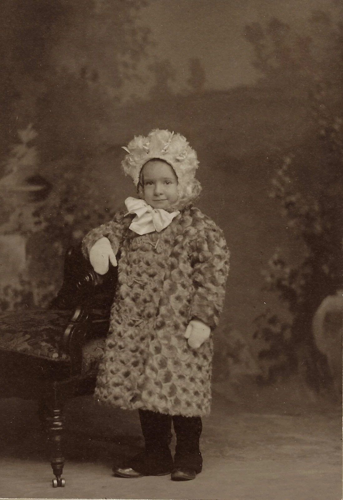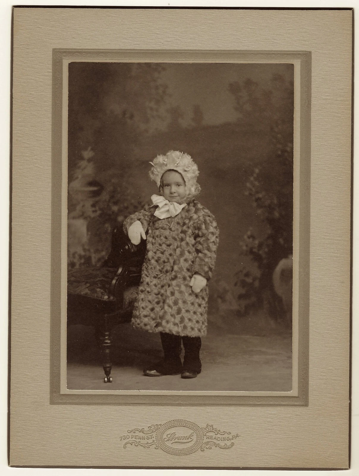 This vintage photograph features a cute little girl all bundled up in her winter outdoor clothing. Her coat and hat are unique by todays standards. She is wearing gloves and a nice grin. This photograph was taken by the studio belonging to John D. Strunk. He was a talented and prolific photographer who operated a studio in Reading, Pennyslvania. According to evidence gathered in preliminary research, he worked as a photographer between 1888 and 1910. This photograph measures about 5 3/4″ x 7 3/4″ and was taken during the last half of his career. An additional aspect of this photograph is that there is a ghost image on it’s reverse. SOLD