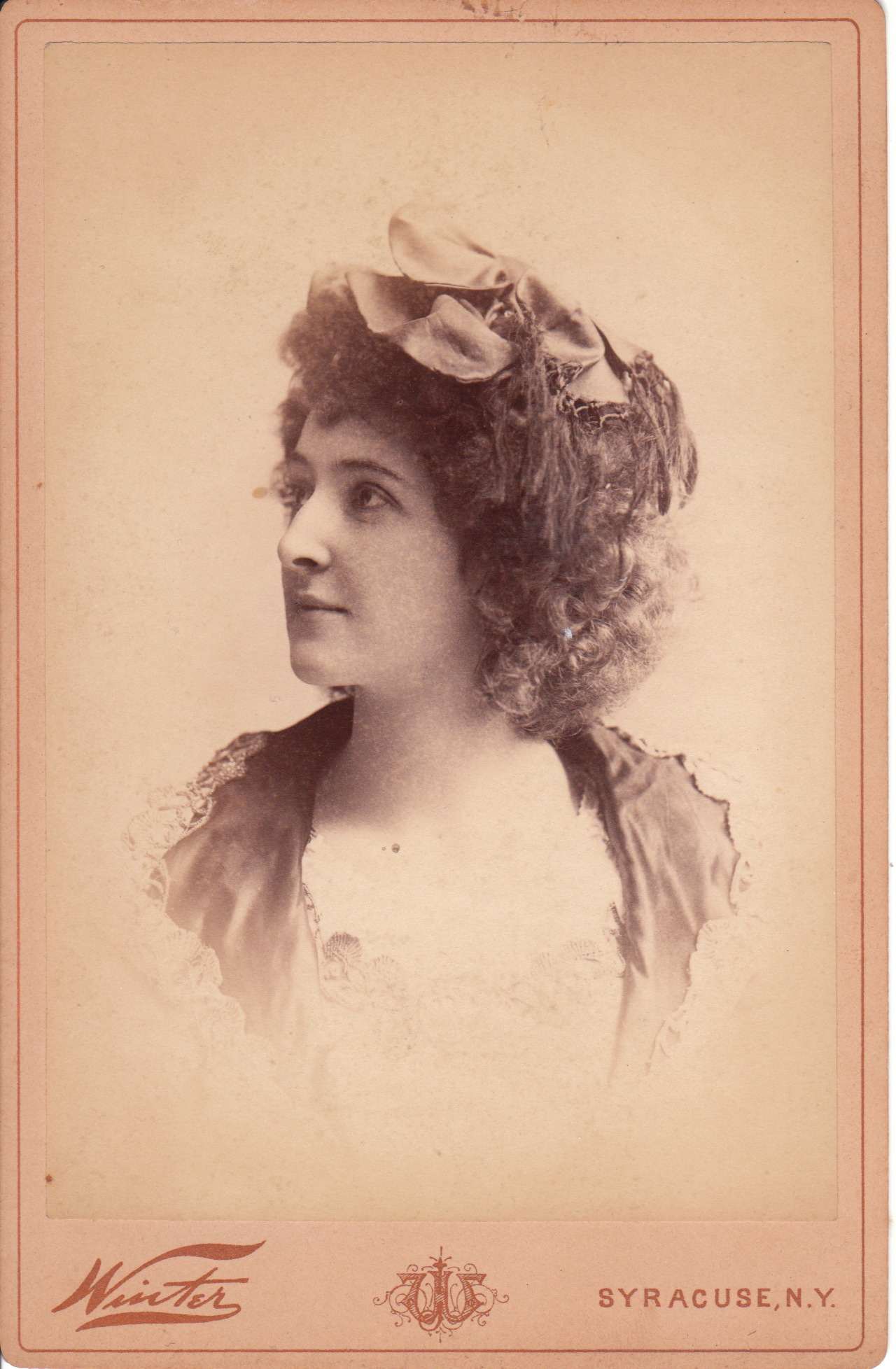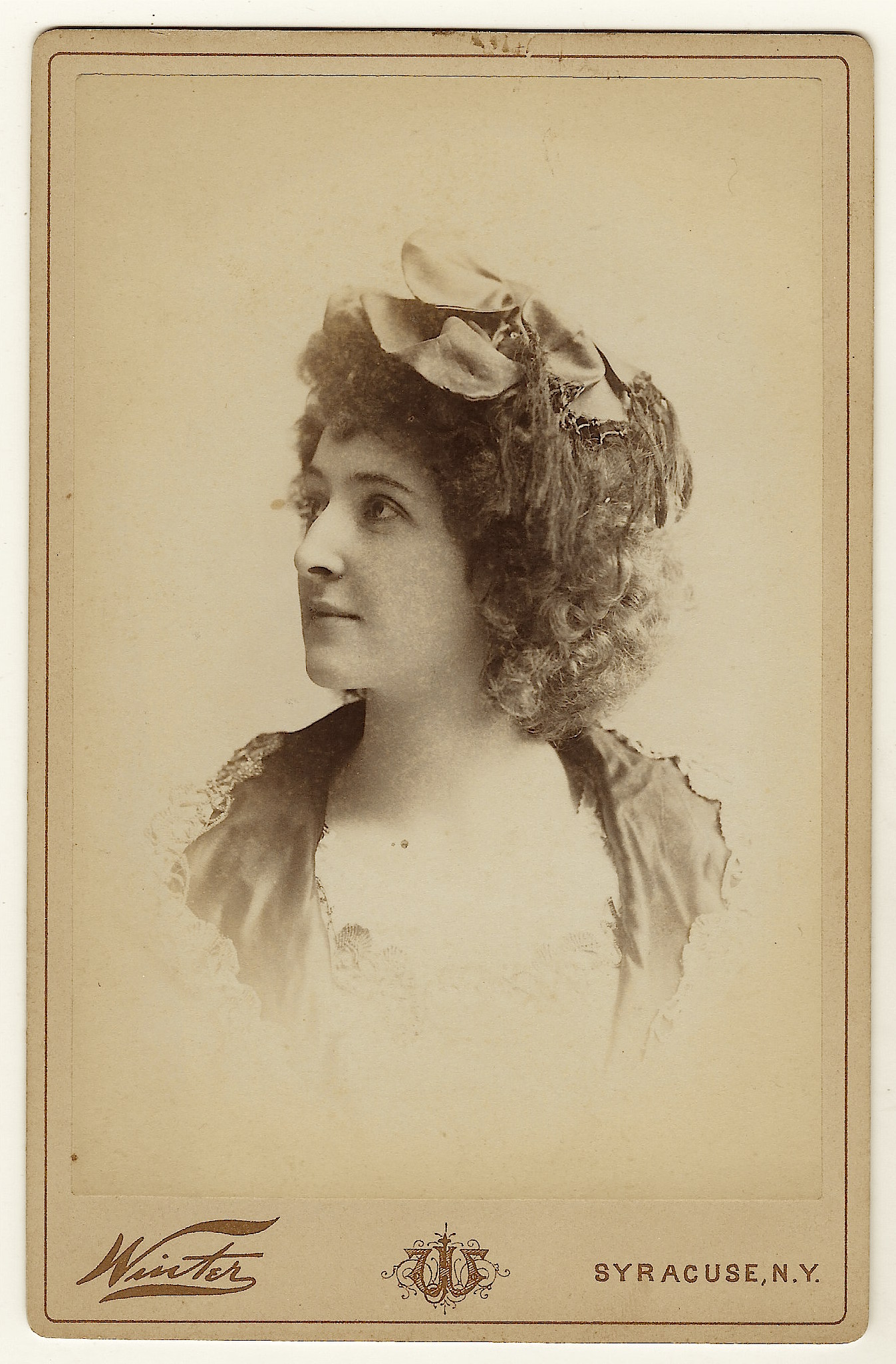 The young woman in this photograph is very pretty. In fact, she has a certain stage beauty that suggests she may have been a member of a traveling theater company appearing in Syracuse, New York. She may have had her portrait taken at Syracuse’s Winter studio. John Winter’s studio was established in 1852 and located at the corner of South Salina and West Washington Streets. The reverse of this photograph has an advertisement for the studio which states that Winter had won a medal for his photography and both the New York State Agricultural Society (1855) and The Syracuse Mechanic’s Association (1856). John Winter Jr., like his father, was a photographer. His father was also a portrait painter. The 1880 US census reports that John W. Winter (1824-1906) was a man of German origin and was married and had five children. One of these children was John Jr., who was a 22 year old photographer. The 1900 US census found John Sr working as a photographer as was his daughter Clara. John Jr (age 41) was also employed as a photographer and he was married to Elizabeth Winter (age 32). The couple had two children, both under the age of three years. John Winter Jr. died in 1917. The Bulletin of Photography (1918) has an advertisement in which Elizabeth Winter offers her husbands gallery for sale. John Winter Jr was cited in a number of photographic journals including The American Amateur Photographer (1891) for his excellent work in producing foreign views (stereoviews) and the St. Louis and Canadian Photographer (1900) for a patent he held for a “Photographic-Negative Vignetter”. A vignetter is a device for blurring the edges of a photographic image with the purpose of fading them into a plain surrounding area. This cabinet card photograph is in good condition (see scans).