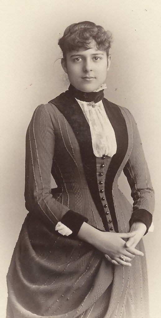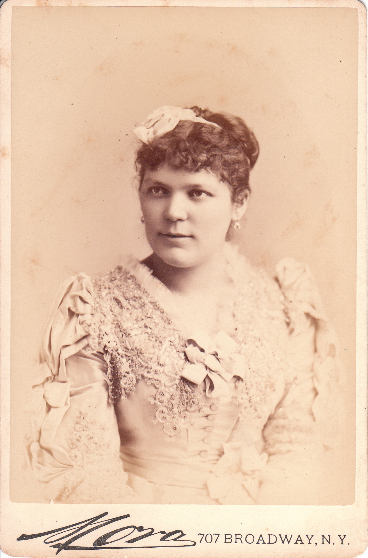 This cabinet card portrait features Hungarian soprano Etelka Gerster (1855-1920). She debuted in Italy in 1876. In 1878 she performed at the Academy of Music in New York City. She earned great international acclaim during her singing career. She unfortunately lost her voice after the birth of her daughter and never sang again. She became a voice instructor and taught singing in Berlin, Germany between 1896 and 1917. She died in Bologna in 1920. This cabinet card portrait was produced by celebrity photographer Jose Mora of New York City. To learn more about him and to view more of his photographs, click on the category “Photographer: Mora”.