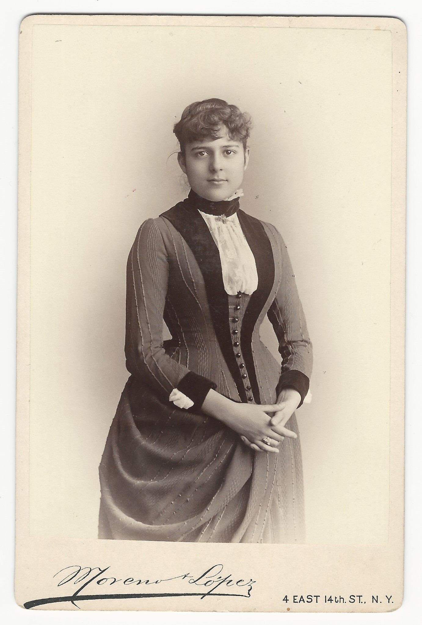 This cabinet card photograph features an attractive and well dressed young woman posing for her portrait at the Moreno & Lopez studio in New York City. An inscription on the reverse of this photograph, identifies the lovely subject of this image as “Maria Estevez”. Miss Estevez has the kind of appearance that causes an observer to mutter to oneself , “I know that she is somebody, but, who is she?”. Antonio E. Moreno was a Cuban painter and graphic artist who became a photographer after seeing the success of his New York based countryman, Jose Maria Mora (see category “Photographer: Mora”). In 1881, Moreno took over a failing New York City photographic studio. The business end of the studio was run by his co-director, Jose Lopez. Moreno developed the business into a great success due to his talent as a photographer, developer and innovator. He became noted in photographic circles and received much acclaim from his participation in photographic expositions. He surrounded himself with talented co-workers. Much of his staff came from Mexico. Spanish cameraman Antonio Urda was considered to be excellent at his craft but was a fiery man who eventually committed suicide by drinking development fluid, after failing to murder printer, Domingo Costello. After this incident, Moreno preferred to hire English speaking Europeans to work at his studio. One of his hires was printer Nahum Lubosh, whom he snared from celebrated photographer B. J. Falk (see category “Photographer: Falk”). Another employee, cameraman A. L. Simpson, pioneered the use of slides utilized in theater sing-alongs. In 1890 Moreno partnered with the Taber Art Company in publishing photographs of beautiful female models in what has been described as “genre scenes and allegories”. The photographs were well posed, precisely lit and very tasteful. Moreno’s gallery was in business for a quarter of a century and was a center for performing arts portraiture. One wonders if the subject of this cabinet card portrait was in fact a theater actress, or one of Moreno’s pretty models. SOLD