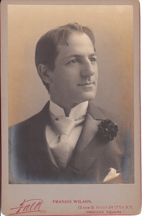 Francis Wilson (1854-1935) was an American actor born in Philadelphia, Pennsylvania. He began his career in minstrel shows but by the time he was 24 year-old he was playing in Philadelphia’s Chestnut Theatre. He worked several years in regular comedy and later took up opera, most successfully in “Eminie” (1886). He later starred in “The Oolah” (1889), The Lion Tamer (1891), The Little Corporal (1898), and then in a play that he authored, “The Bachelor’s Baby (1909). Wilson authored additional plays as well as books. He wrote  books about fellow actors Joseph Jefferson and John Wilkes Booth. He also penned an autobiography. The photographer of this cabinet card portrait of the handsome Wilson, is Falk, a photographer known for his celebrity portraits. This cabinet card has an extremely slight curl and is in overall good condition (see scans).