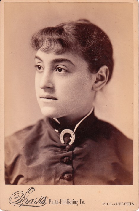 A beautiful young actress poses for her portrait at The Sparks studio in Philadelphia, Pennsylvania. She is wearing a horseshoe broach which probably was supposed to bring her good luck. This actress’s name was Marion Elmore. She was born in 1860 in a tent in Sandhurst, Australia. Her parent were English and they were in Australia because they were hoping to hit it big in the Gold Rush. Elmore began her acting career at age three. She played in Rip Van Winkle with touring American actor, Joseph Jefferson. In the 1870’s she was a member of Lydia Thompson’s famous burlesque troupe. “The Blondes” performed a risque mix of songs, dance and comedy. They also were very well known for showing a great deal of leg in their revealing costumes. She came to the United States in 1878 with the troupe but soon went off on her own as an actress and vaudeville performer. Her first starring role was in Chispa (1883). This play was poorly reviewed. The “Virtual Dime Museum” quotes the journal “Music and Drama” which wrote that the play “was dramatic rubbish, and that it does not fit Marion Elmore any better than her straw hat, which was continually falling off”. The New York Times (1882)  also lambasted the play. The critic had mixed feelings about Miss Elmore, but stressed her negatives. He blamed actress Maggie Miller for perpetuating a type of actress that he found abhorrent. These actresses were seen as stock actresses who rose to “money making dignity” by performing in troupes like Lydia Thompson’s Blondes. He described Elmore as a “vivacious exponent of the high art of leg burlesque”. The critic asserts that the craze surrounding Lydia Thompson, and other similar troupes, was one of the worst stupidities of the stage” and that he was pleased that the popularity of this type of entertainment had become “extinct”. On the positive side, the critic enjoyed Elmore’s sense of humor and her “brightness”.  One fortuitous outcome of her acting in Chispa was that she fell in love with, and in 1884, married her co star, Frank Losee. Another actress in Chispa was Lina Merville. Her portrait can be found in the Cabinet Card Gallery via the search box. As Elmore’s career continued, she acted in many plays in the New York area. She was active through the 1890’s and the early twentieth century. She died at age ninety in 1950. To view other photographs of actresses by Sparks, click on the category “Photographer: Sparks Photo Publishing Co.”.